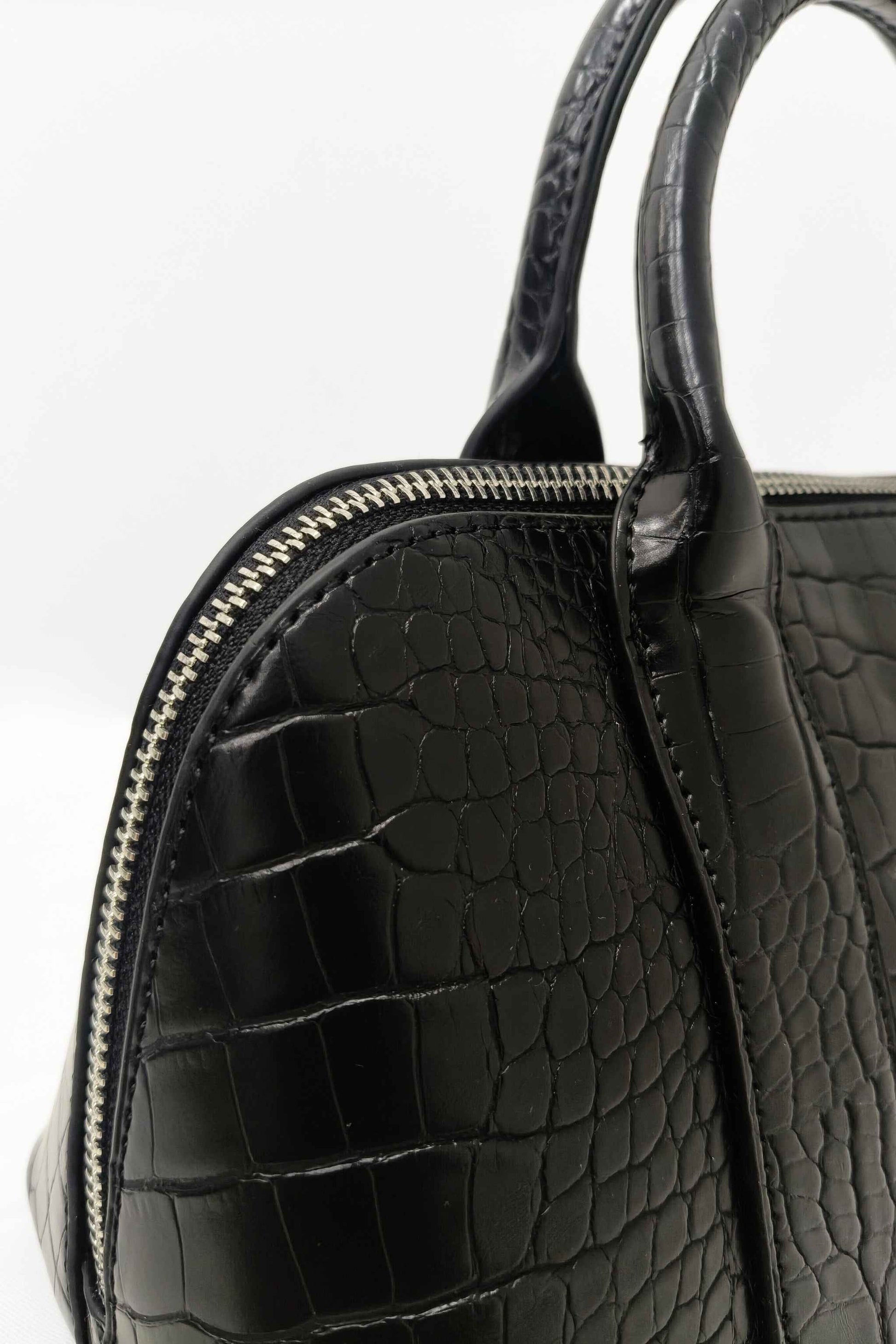 Bolso mini en acabado efecto PIEL DE cocodrilo color ROJO CARMEESI, diseño estructurado ,CON asa superior Y CORREA EXTRA DESMONTABLE,Interior con compartimentos y bolsillo con cremallera. Cierre mediante solapa y bROCHE METALICO .para un look elegante y moderno