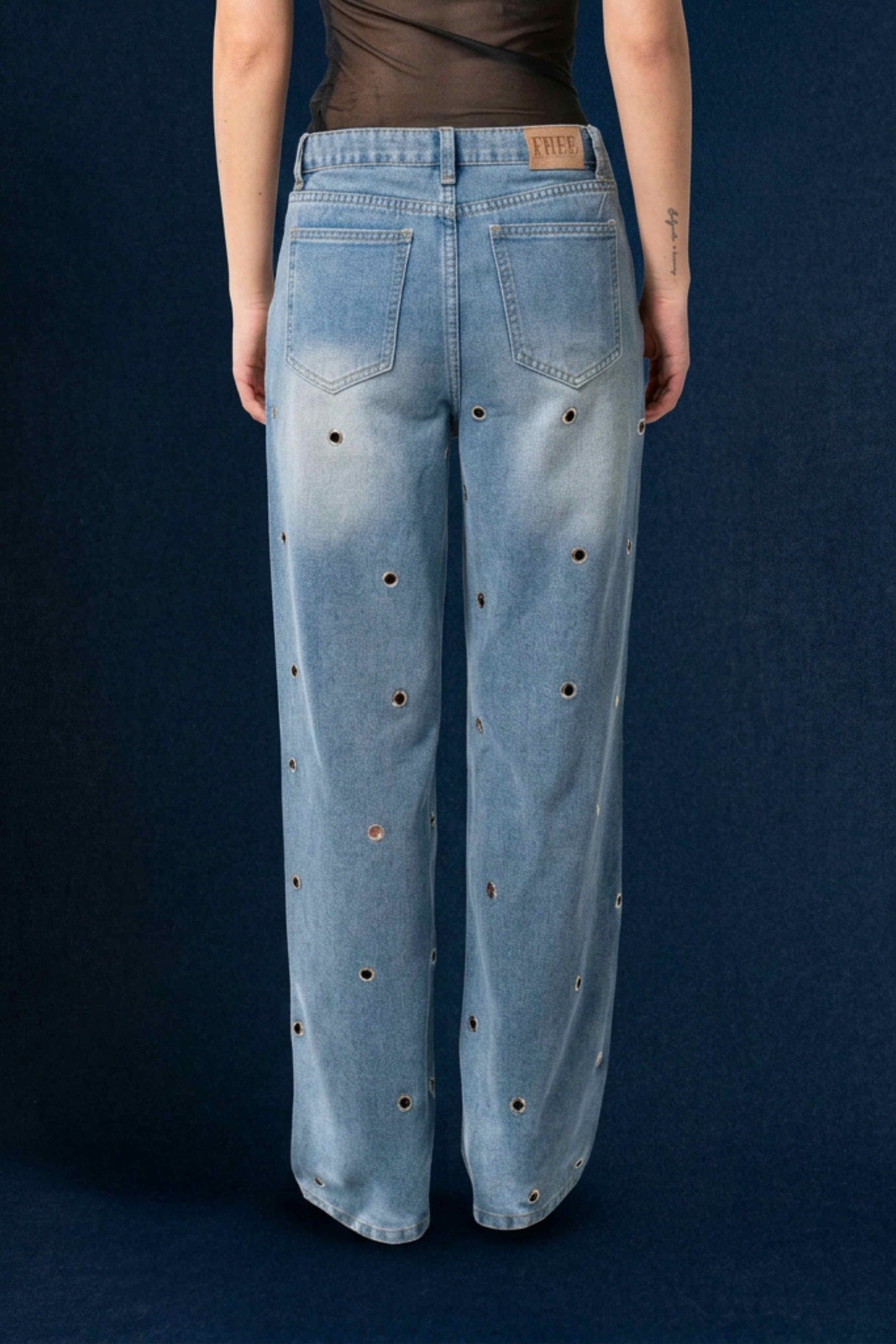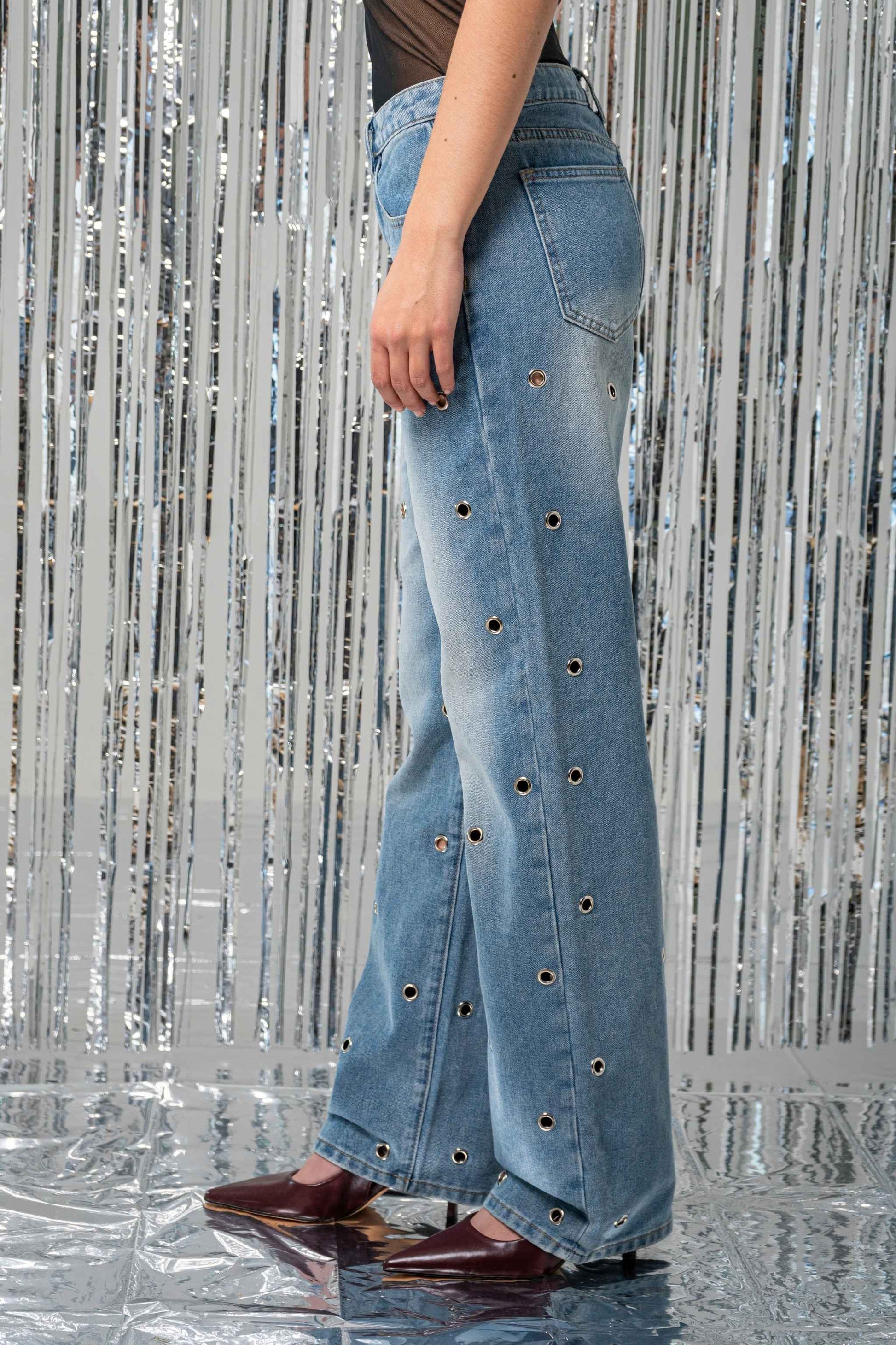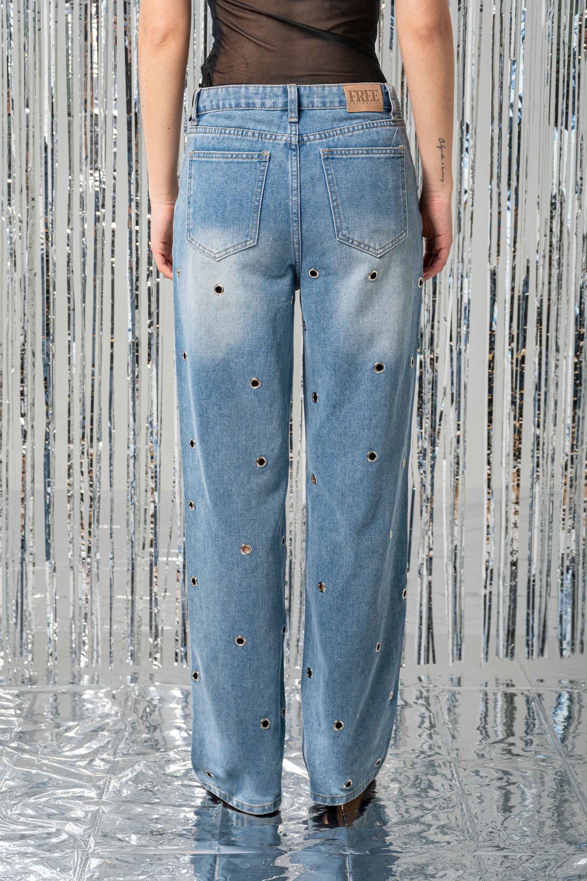 Jeans straight fit de tiro alto , con diseño de cinco bolsillos. Cierre frontal con cremallera y botón metálico. detalle de apliques en ojaletes.