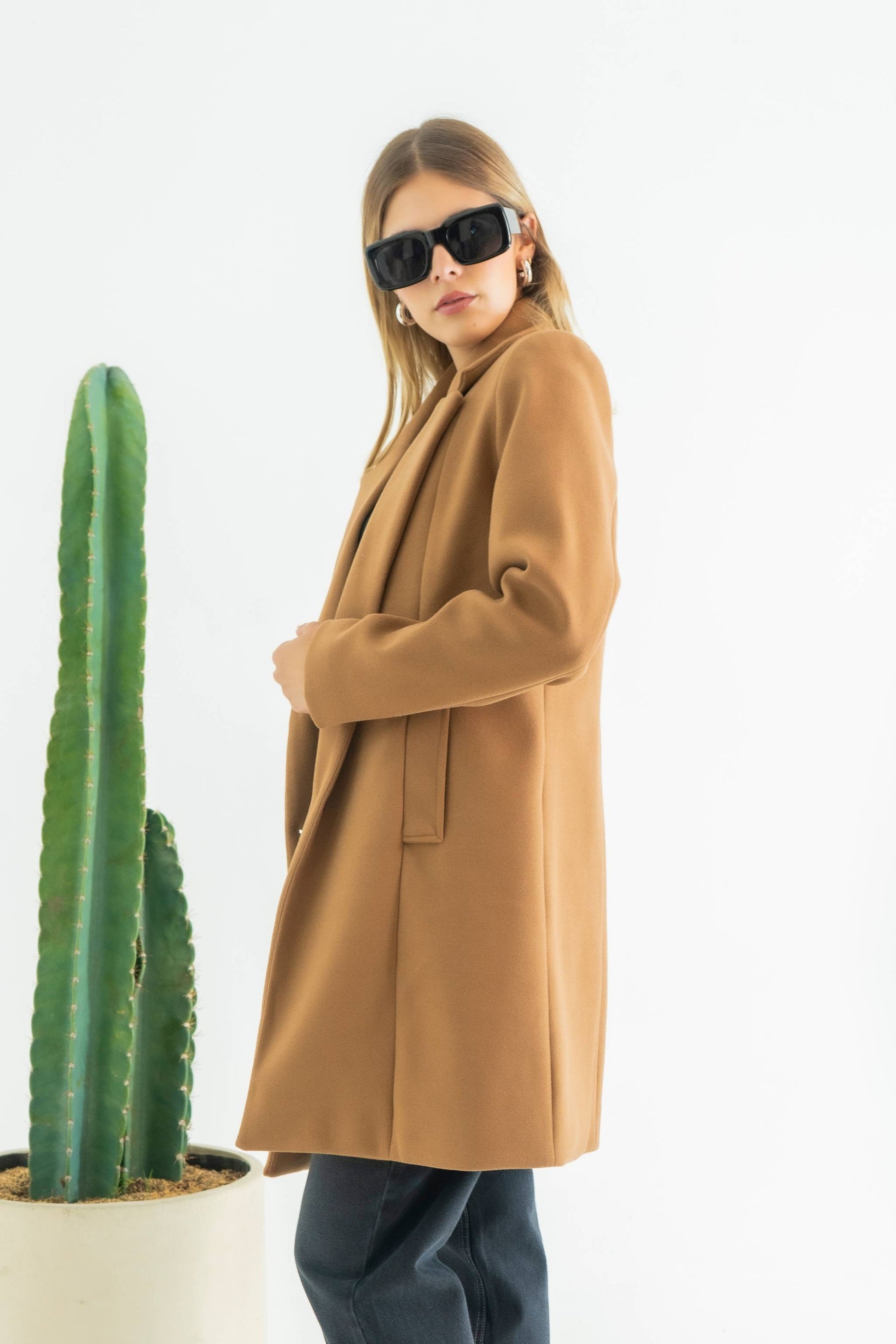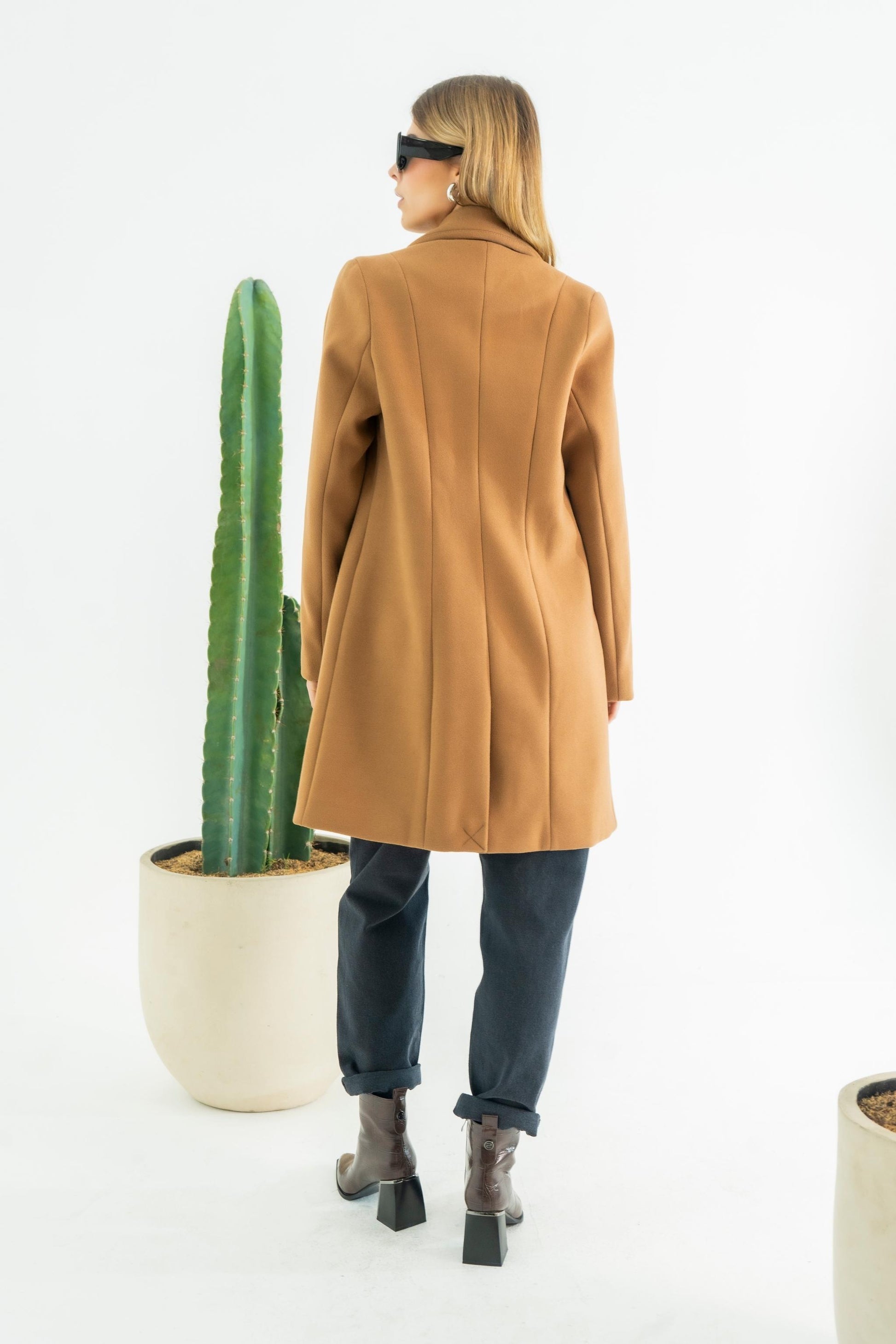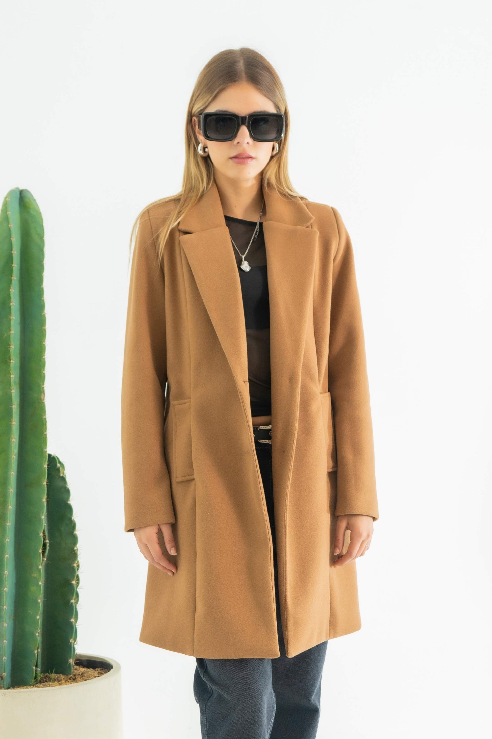 Abrigo midi cuello solapa sistema de sierre frontal con botón, posterior con abertura manga larga recta