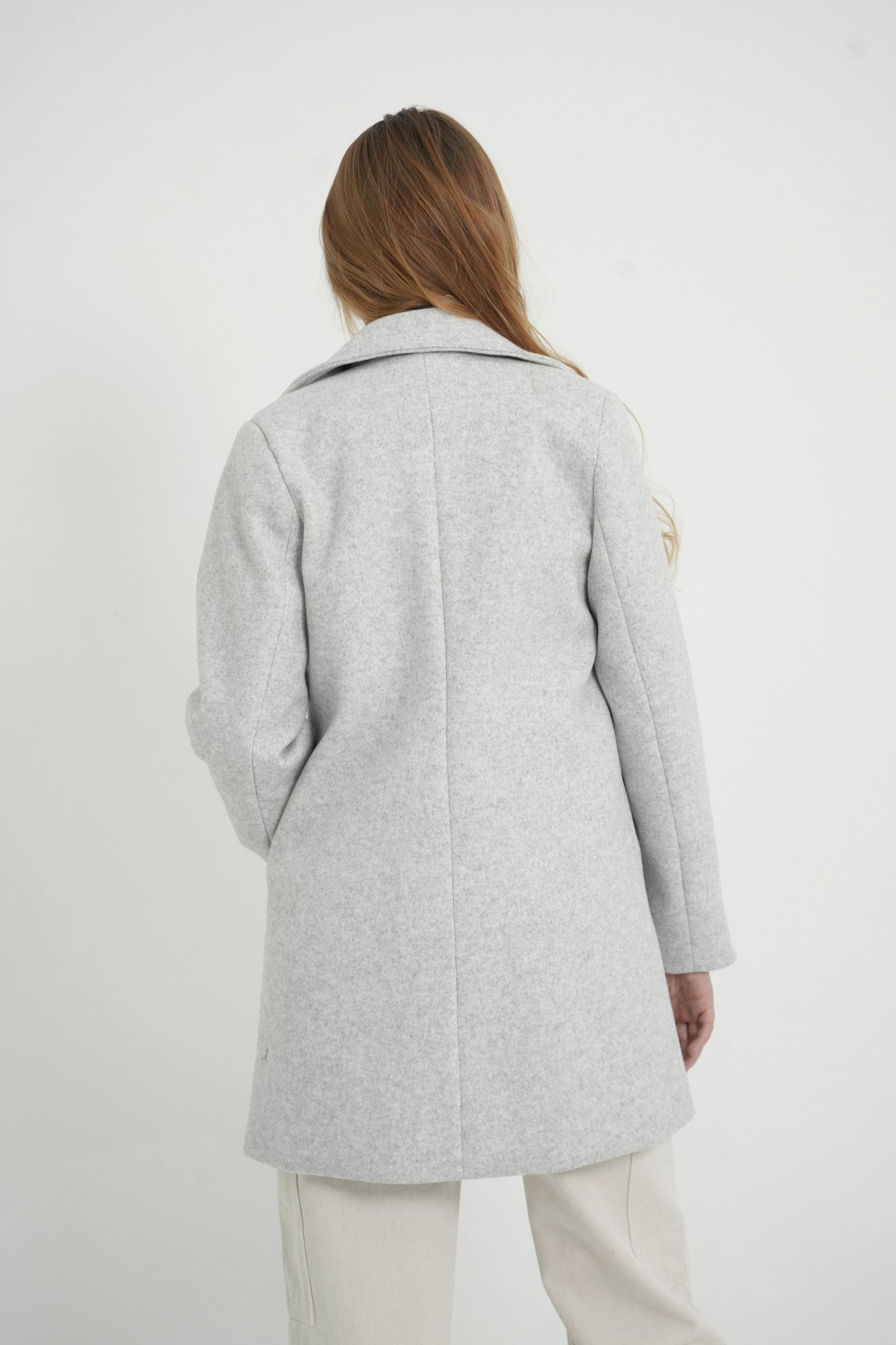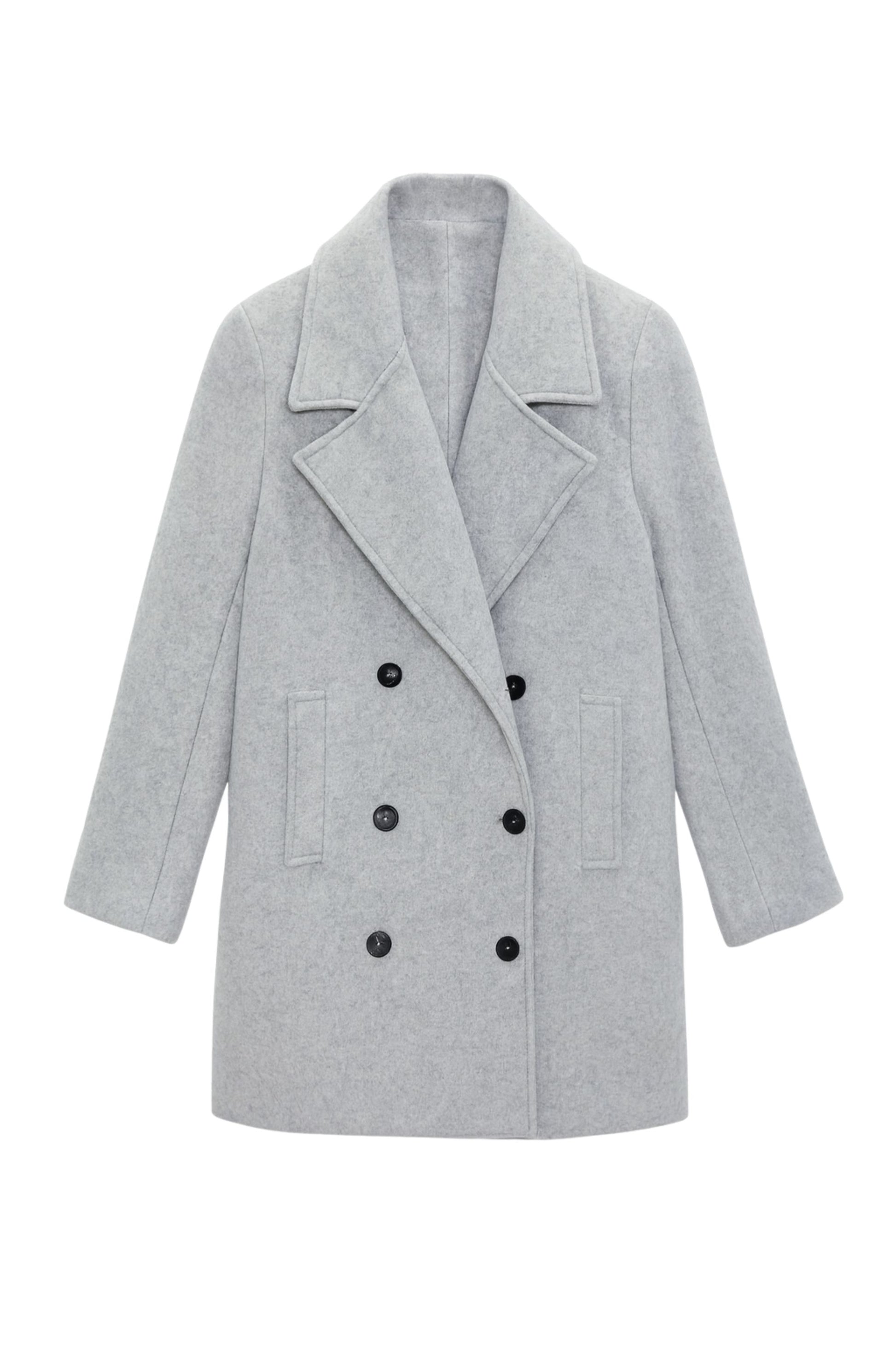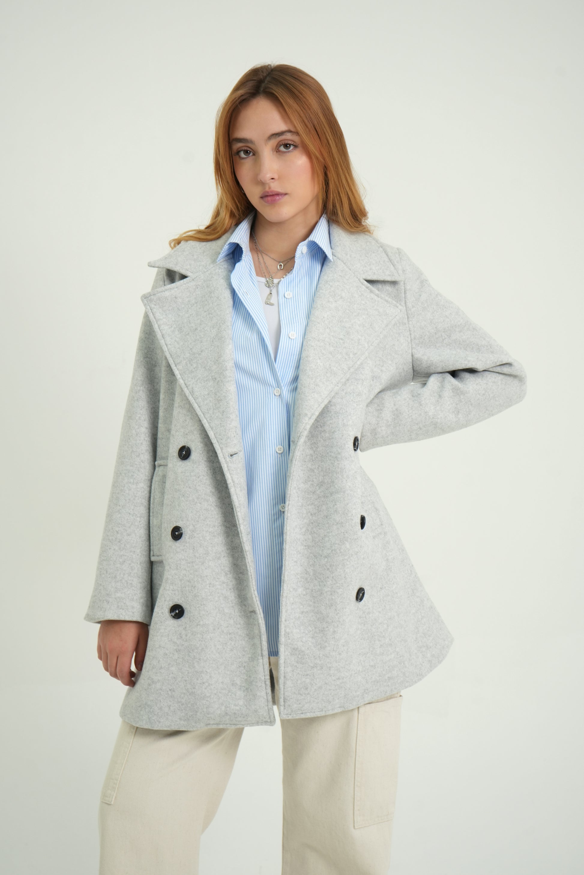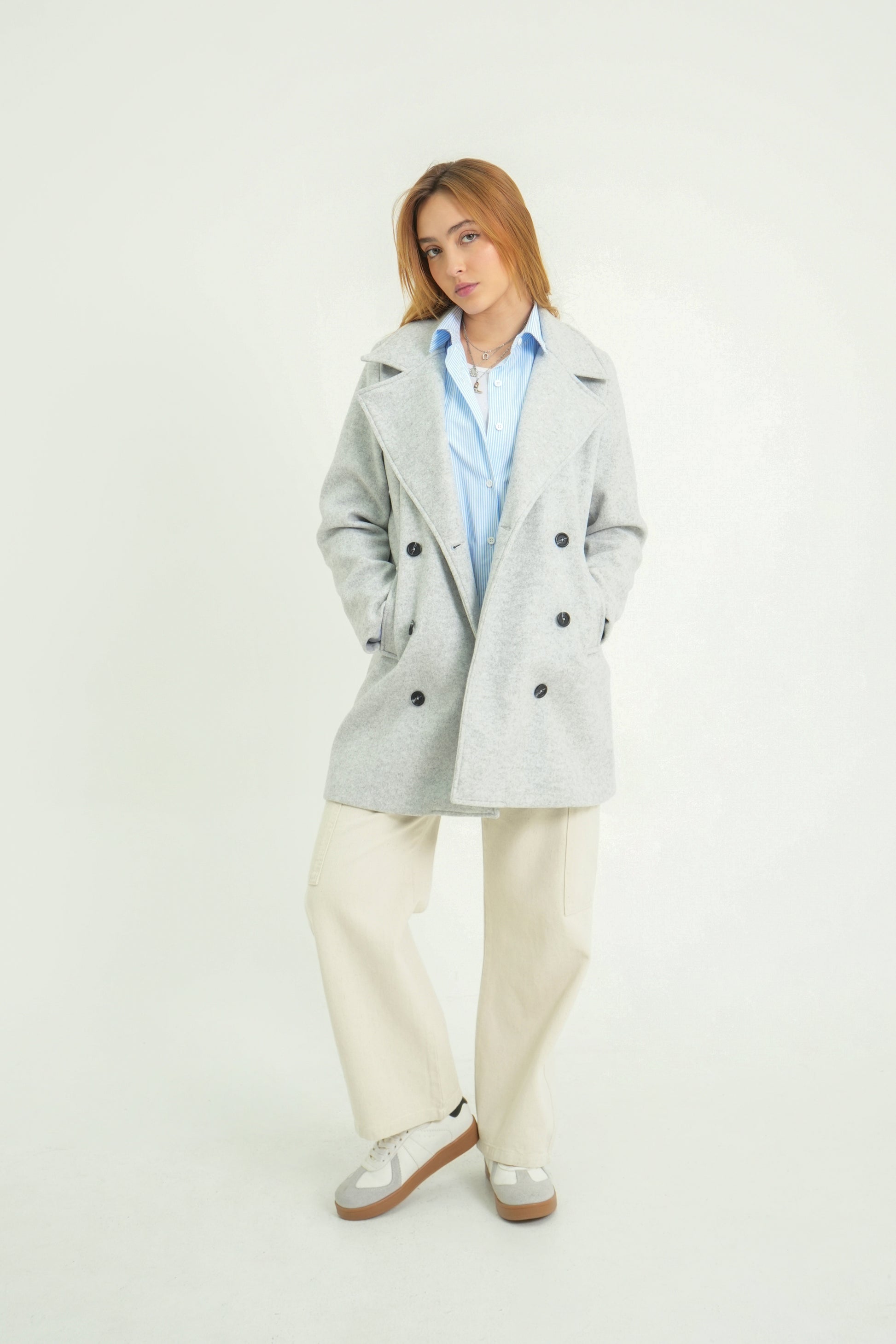 Abrigo femenino en tejido Collins (90% poliéster, 10% rayón), disponible en beige, negro y gris. Su diseño cruzado y hombreras estructuradas realzan la silueta con estilo y comodidad.