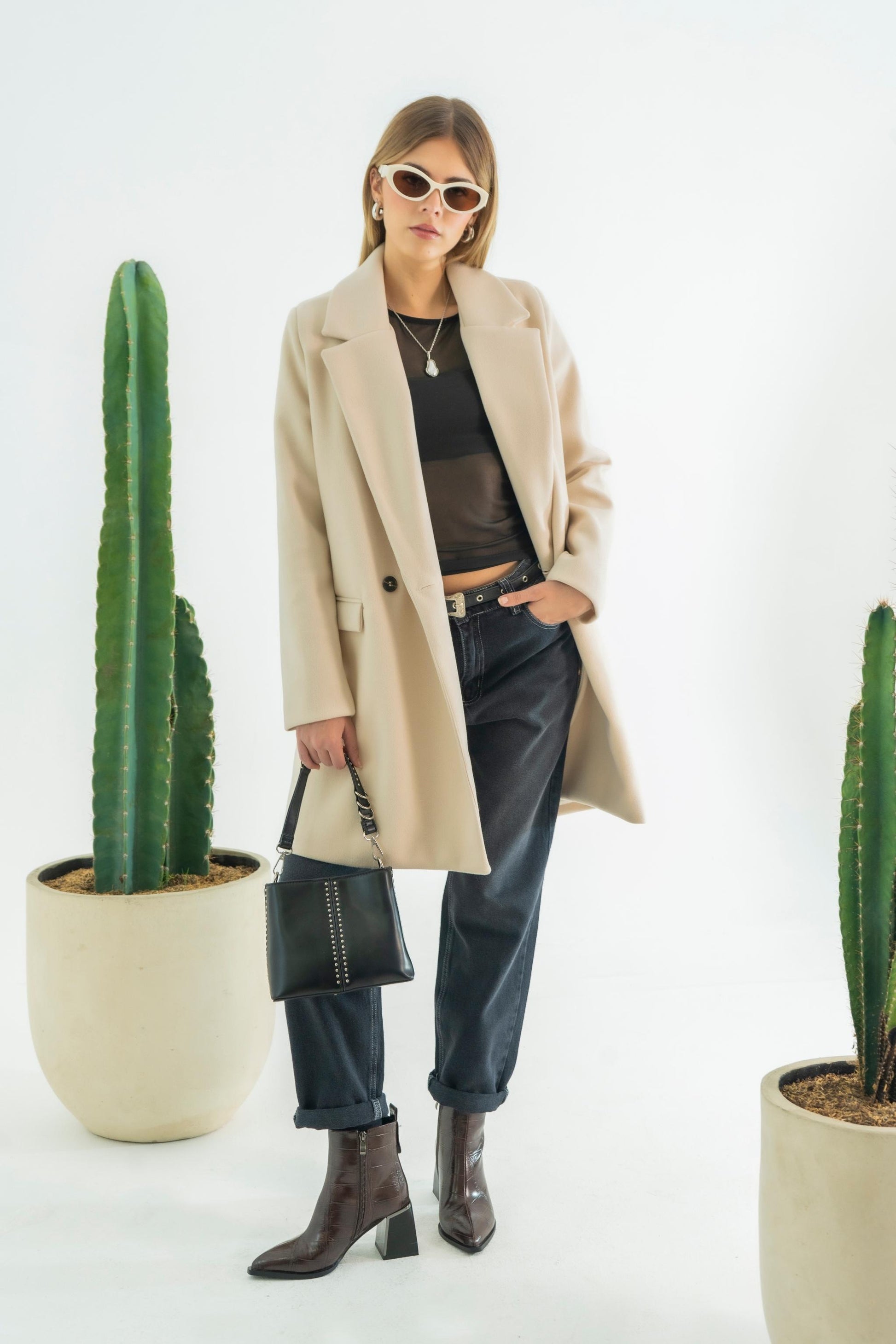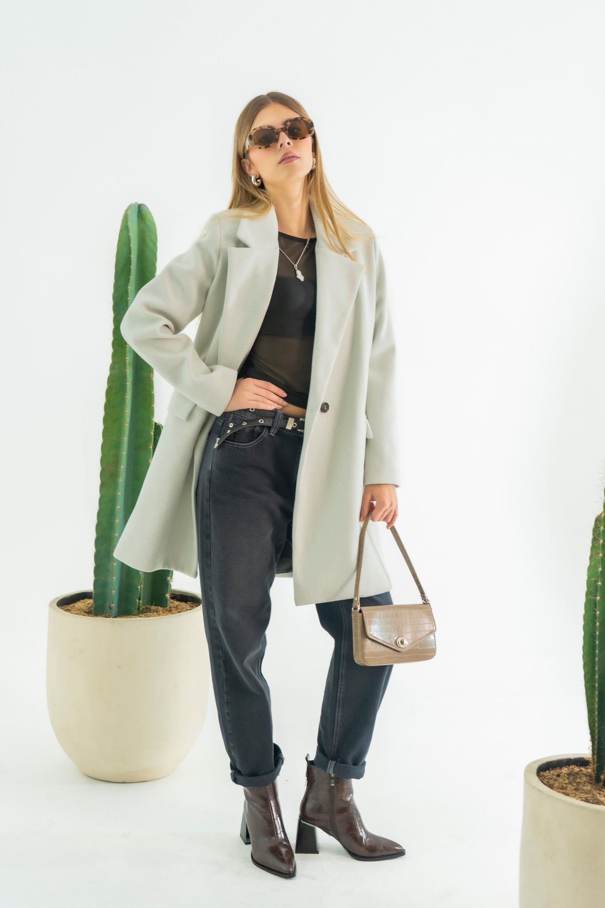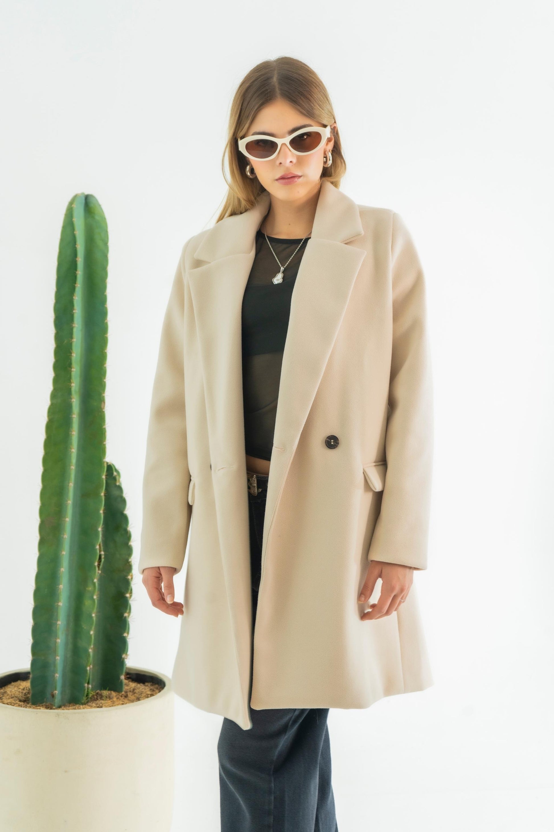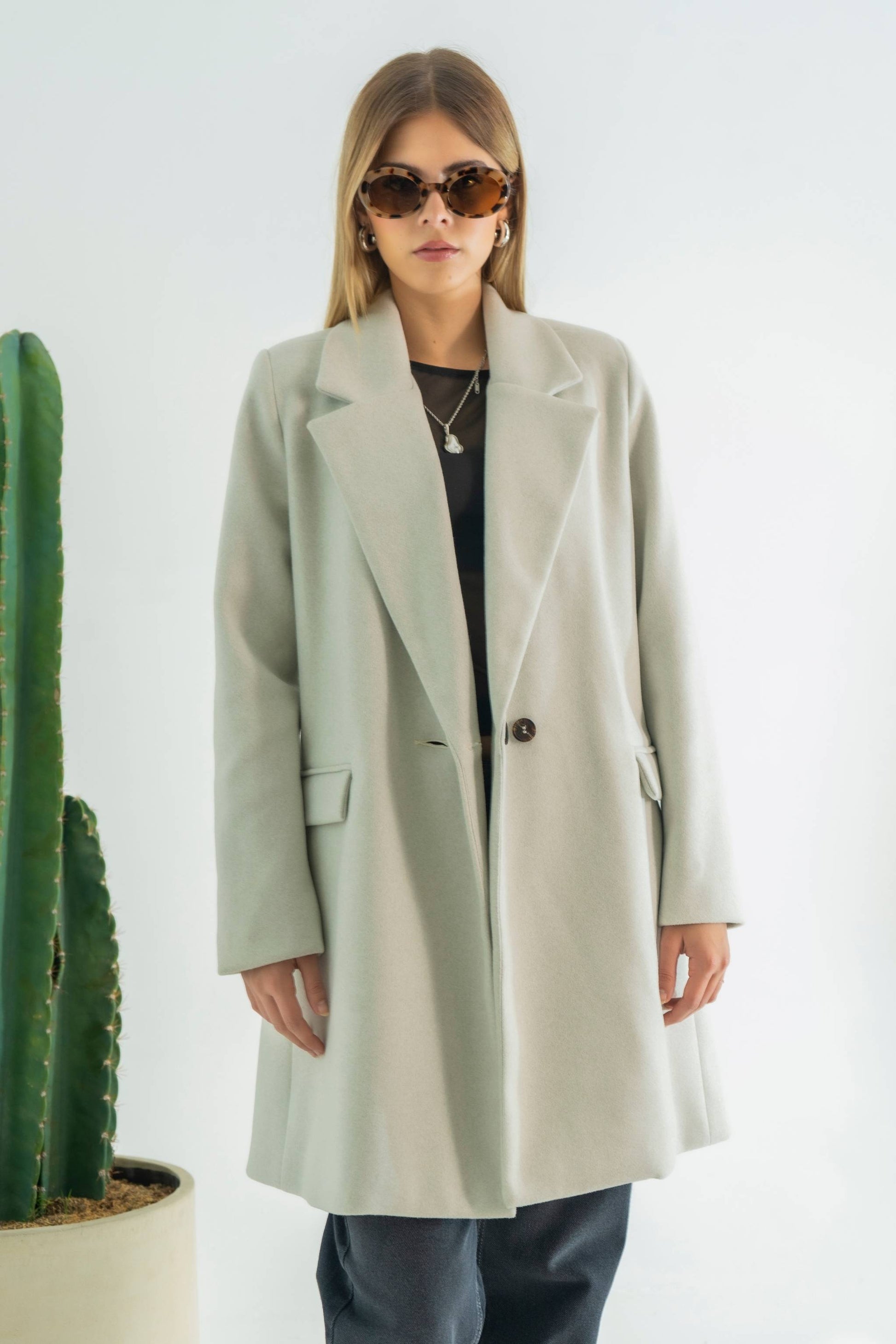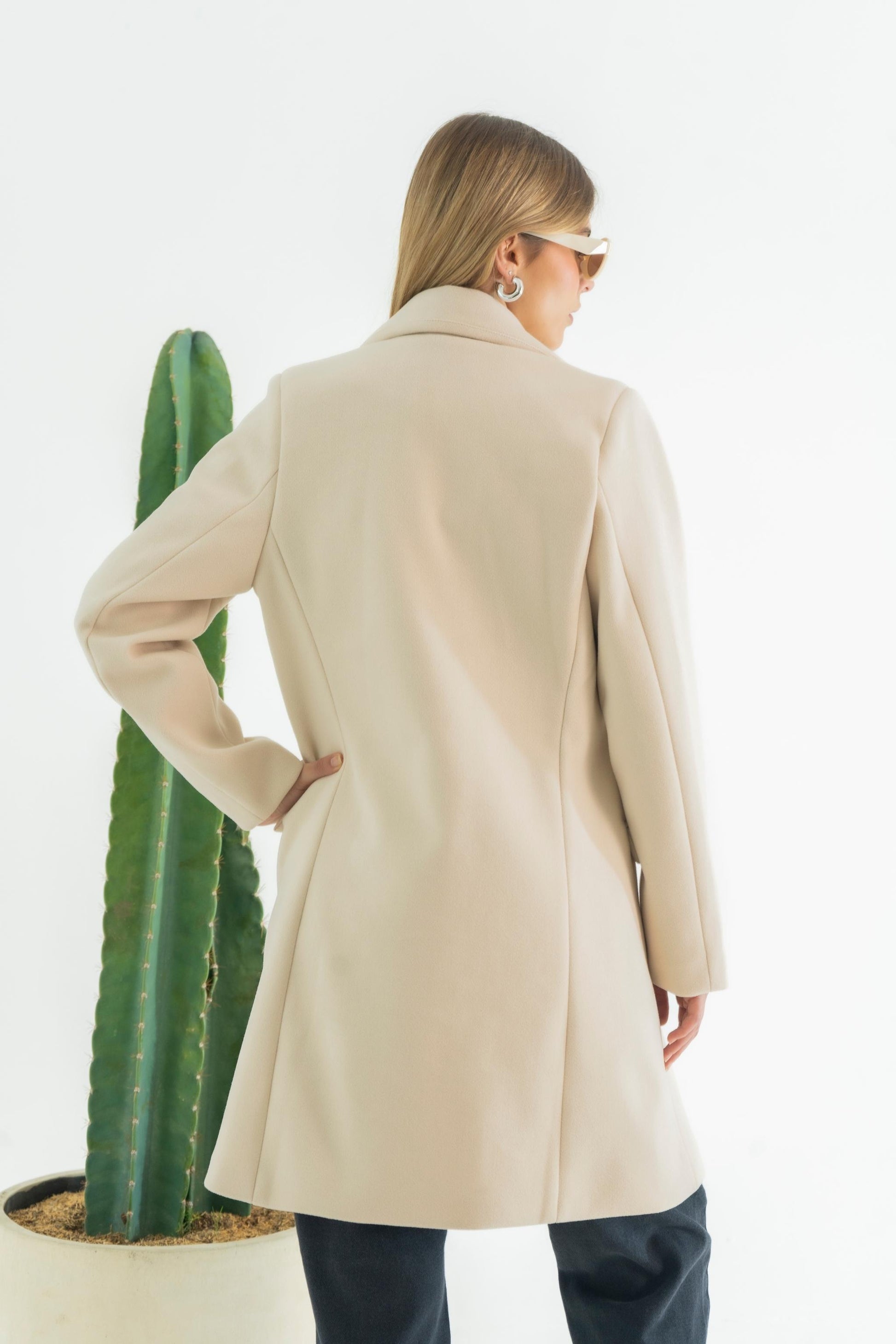 Abrigo midi cuello solapa con cruce , sistema de sierre frontal con botón, bolsillos delanteros funcionales