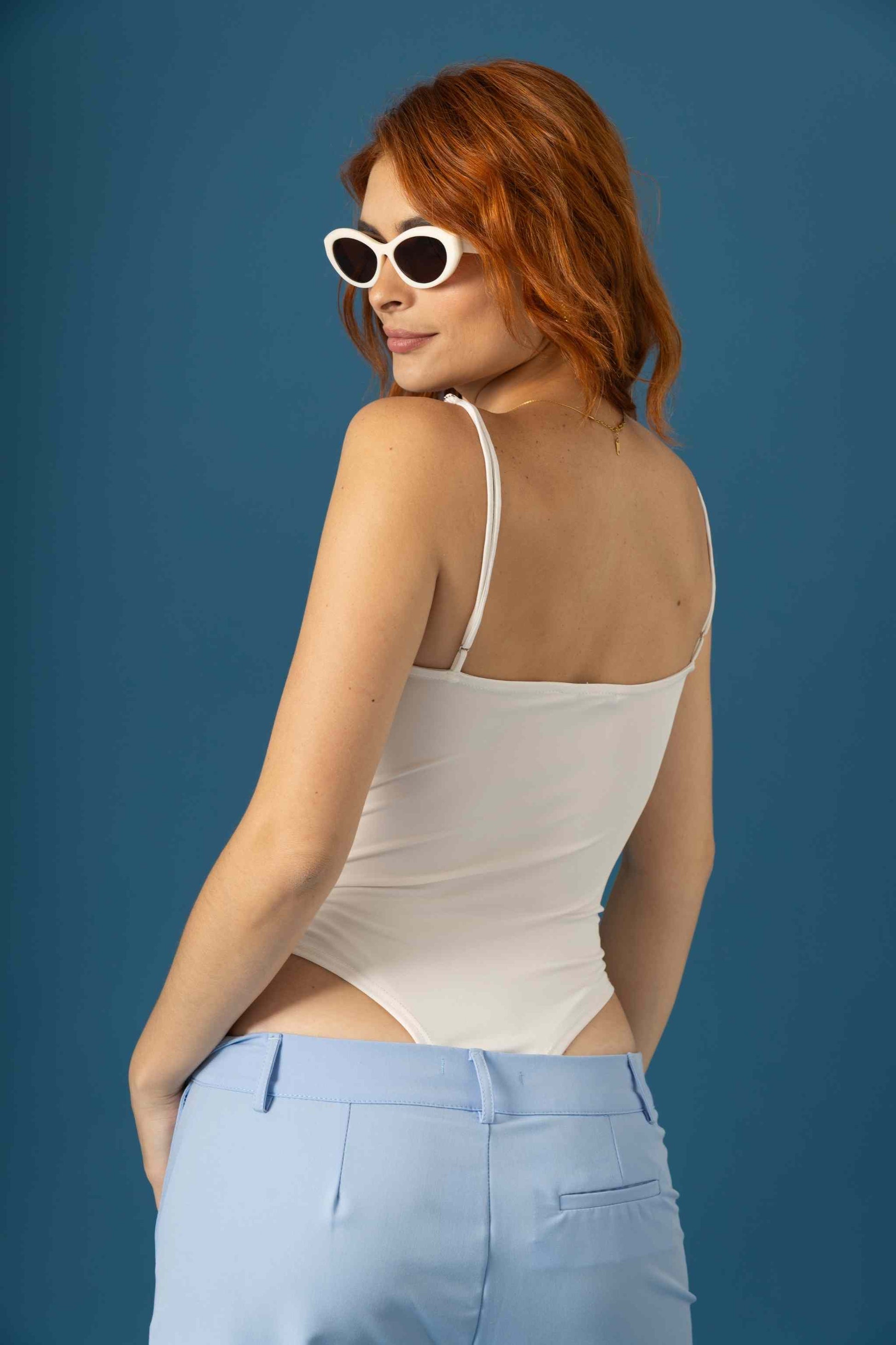 Body con tiras graduables, escote drapeado y recogido en laterales, sistema de cierre con broche en entrepierna.