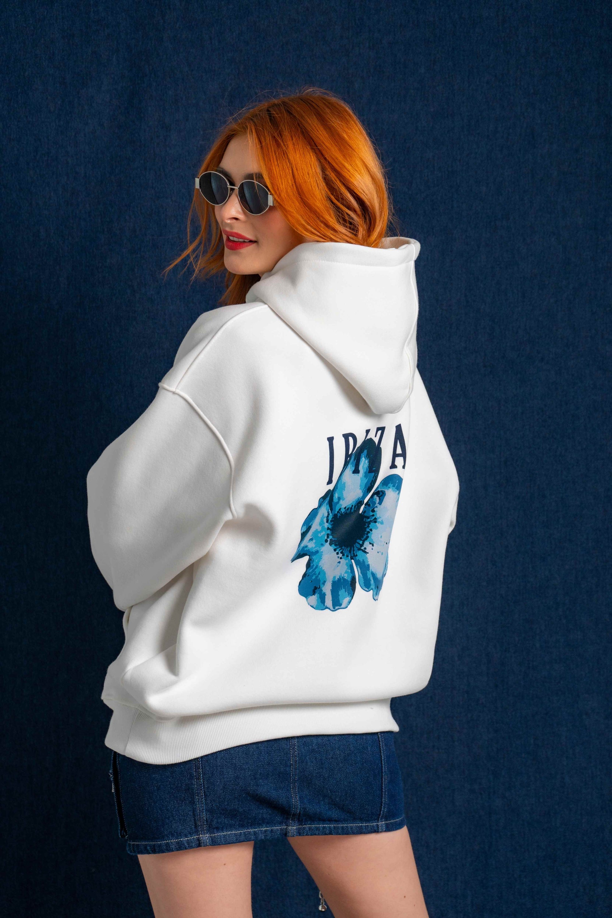 Buzo oversize con capota, bolsillo tipo canguro, manga larga terminados en rib.