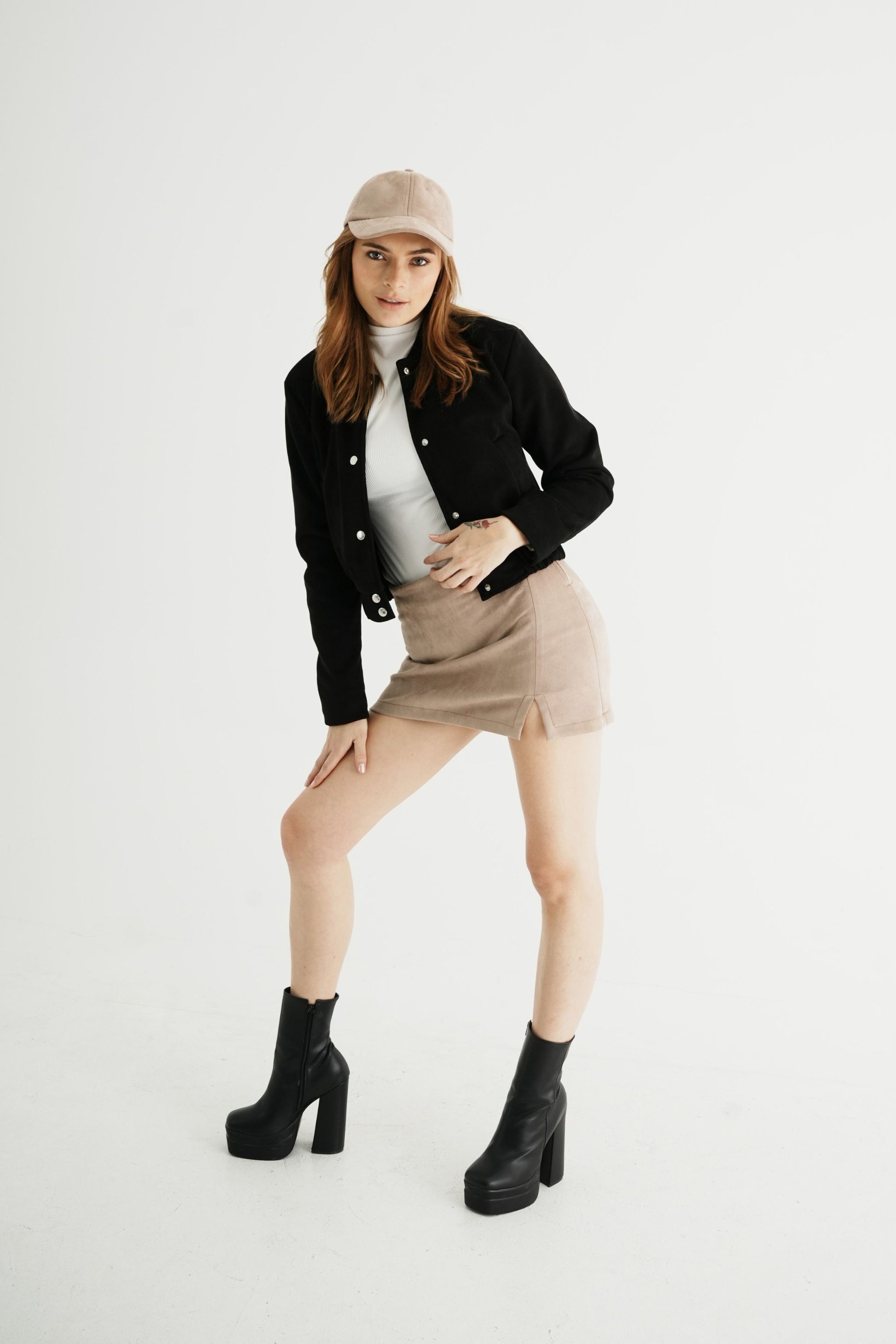 Chaqueta femenina tipo bomber elaborada en Scuba Suede (92% poliéster, 8% nylon), con acabado gamuzado en tonos negro, verde o ivory, ideal para un look moderno y urbano. Su textura suave y estructura ligera la hacen perfecta para el día a día.