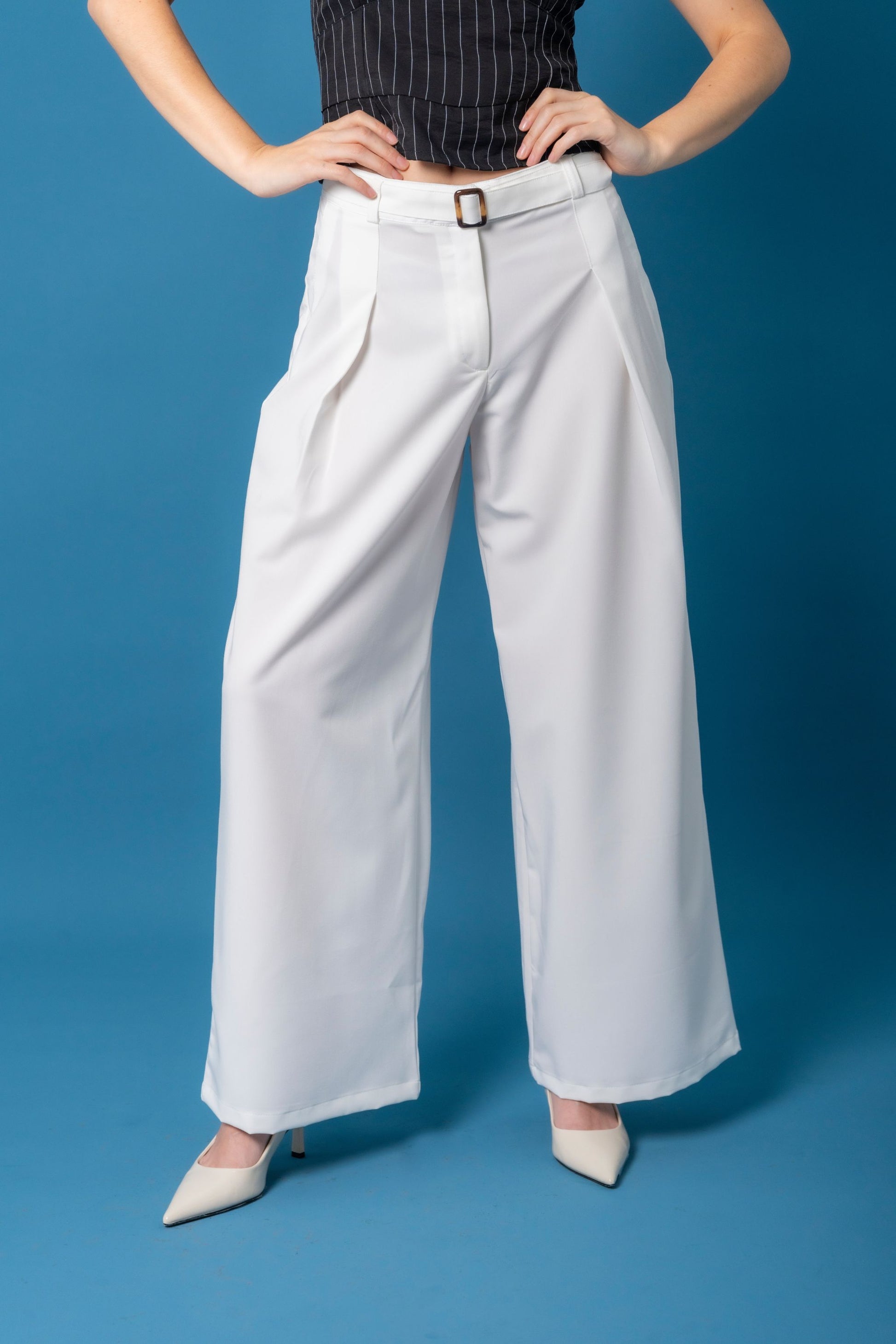 Pantalón tiro alto, prenses en delantero, bolsillos laterales, cinturón decorativo