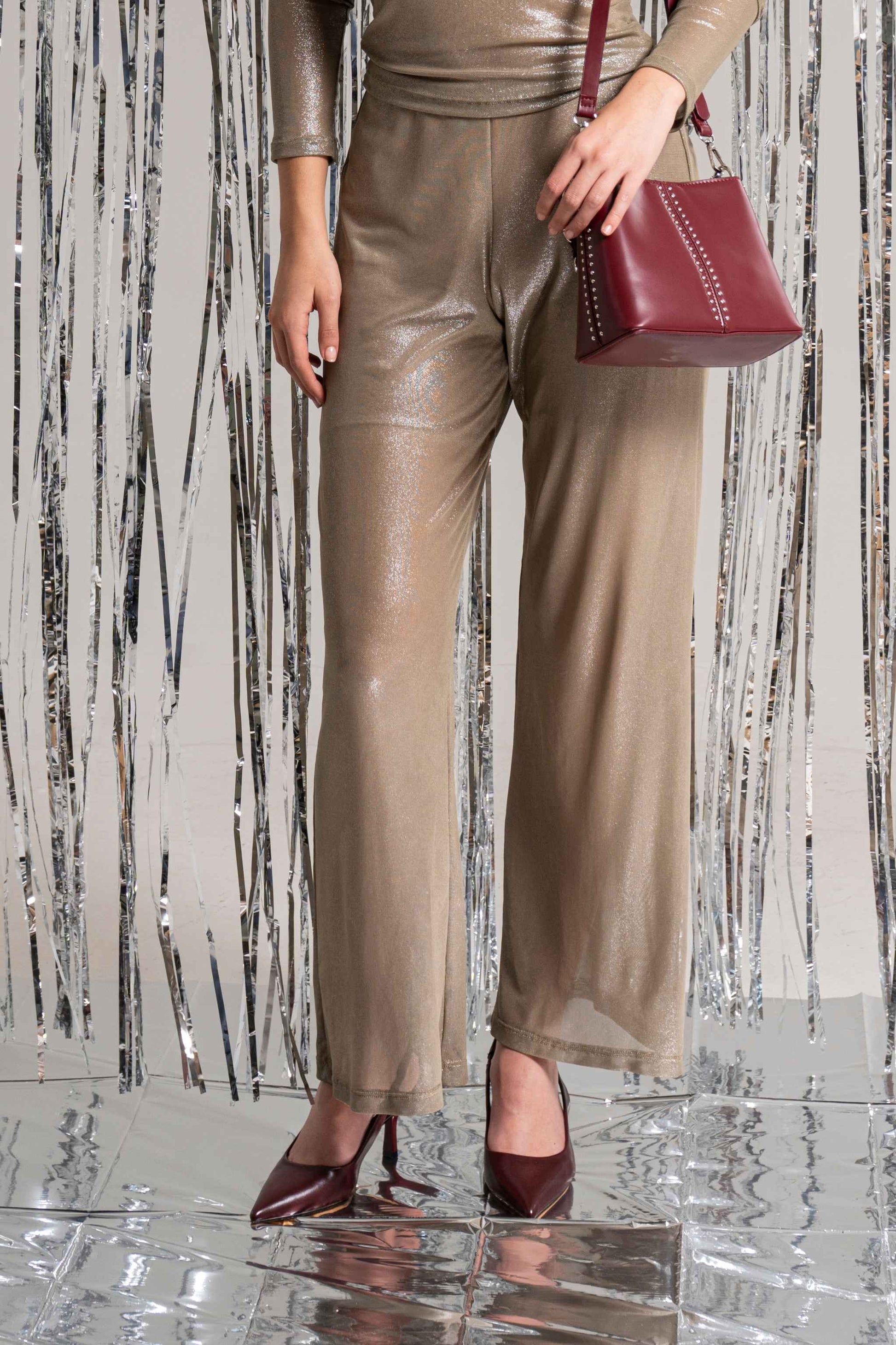 PANTALÓN wide leg confeccionada EN TEXTIL mesh semitransparente, acabado sutilmente BRILLANTE, SILUETA Tiro alto y cintura elástica.