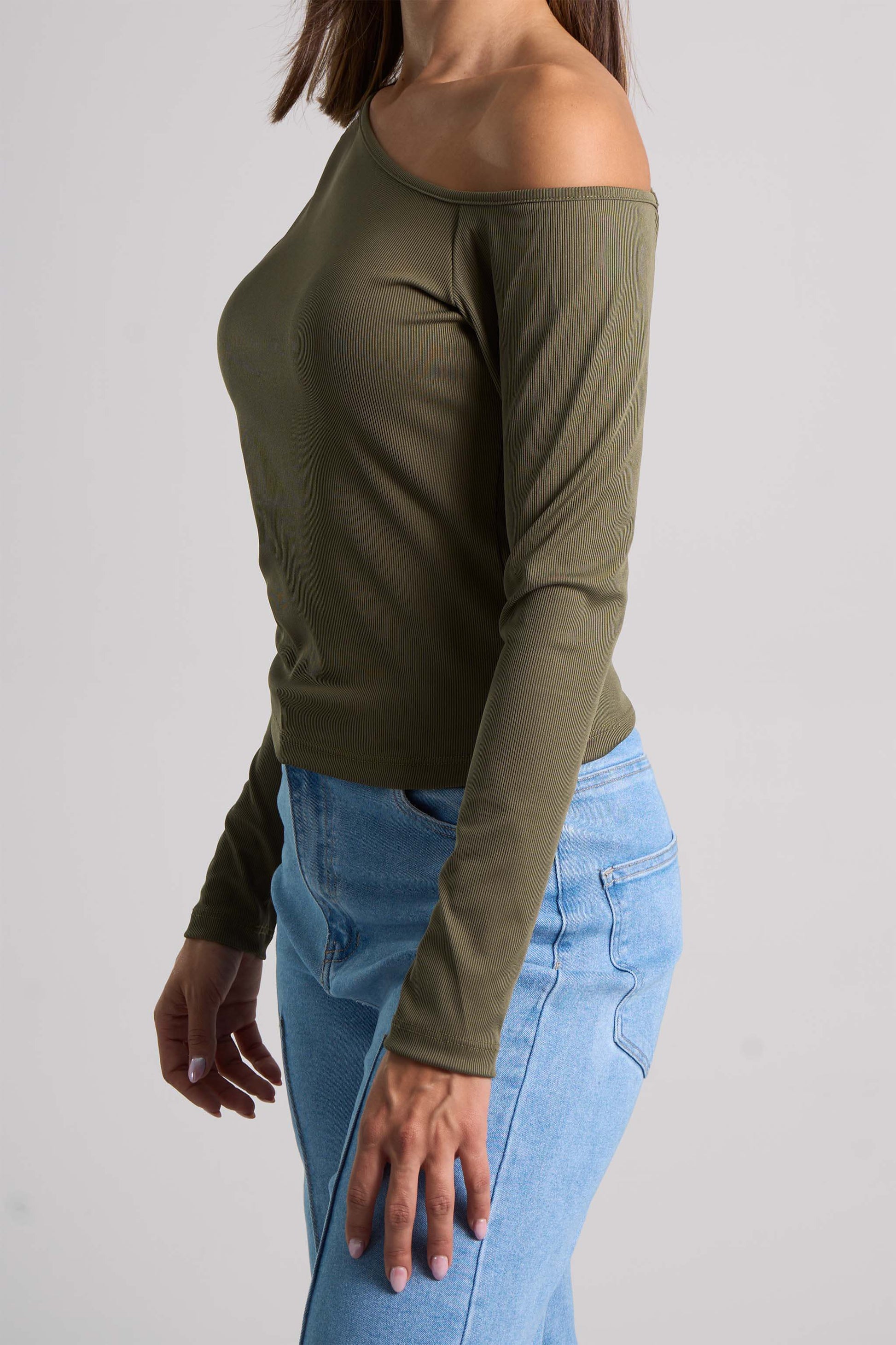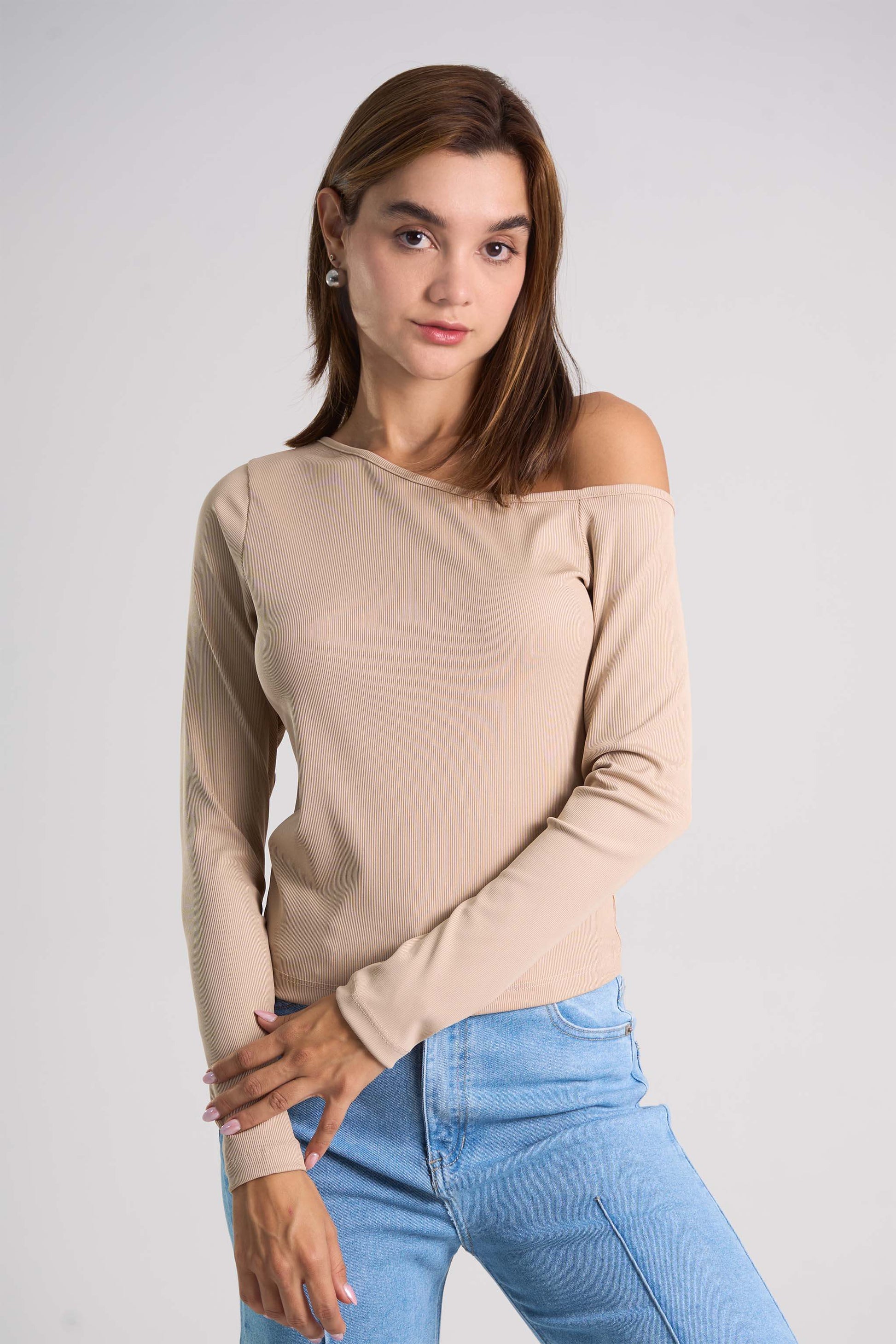 Top femenino de manga larga con diseño asimétrico, ideal para elevar tus looks con un toque vanguardista. Confeccionado en tejido KP10900/Andorra (91% poliéster, 9% spandex), una base suave, cómoda y elástica que se ajusta al cuerpo sin perder su forma. Disponible en tonos tierra como verde oliva y beige, versátiles y atemporales.