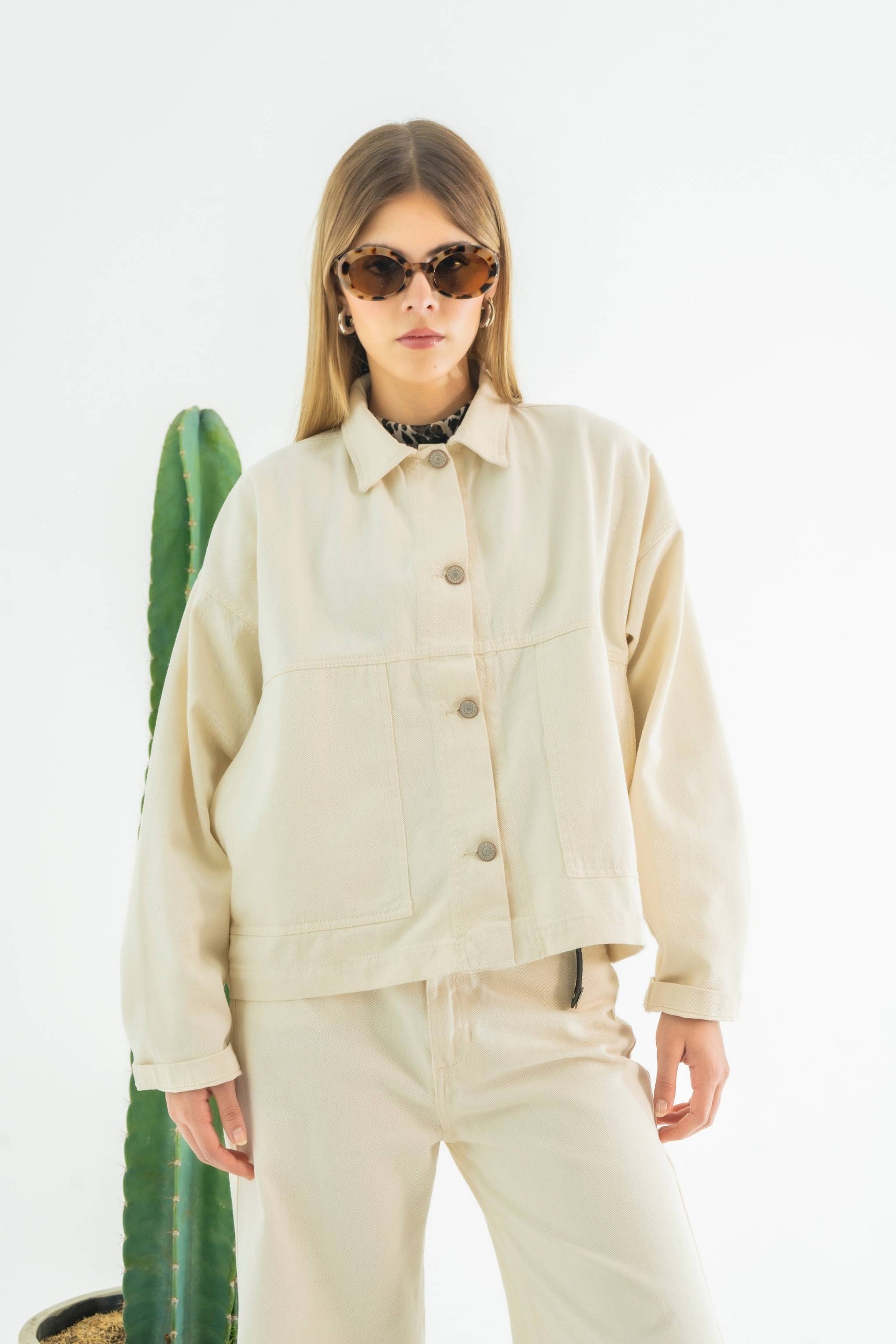Chaqueta cuello camisero cierre frontal con botón metálico , bolsillos funcionales, manga larga.