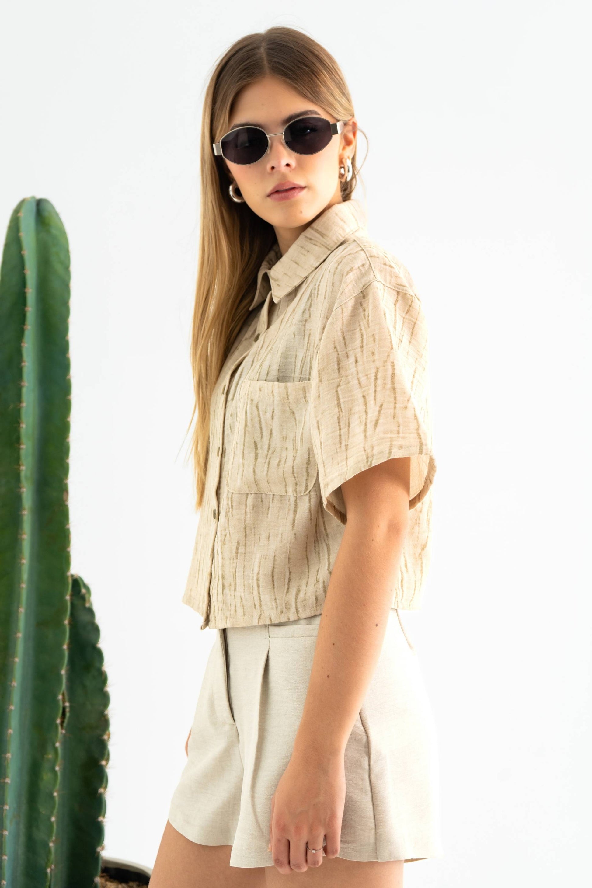 Camisa cuello camisero con abotonadura frontal , manga corta bolsillos parche delantero.