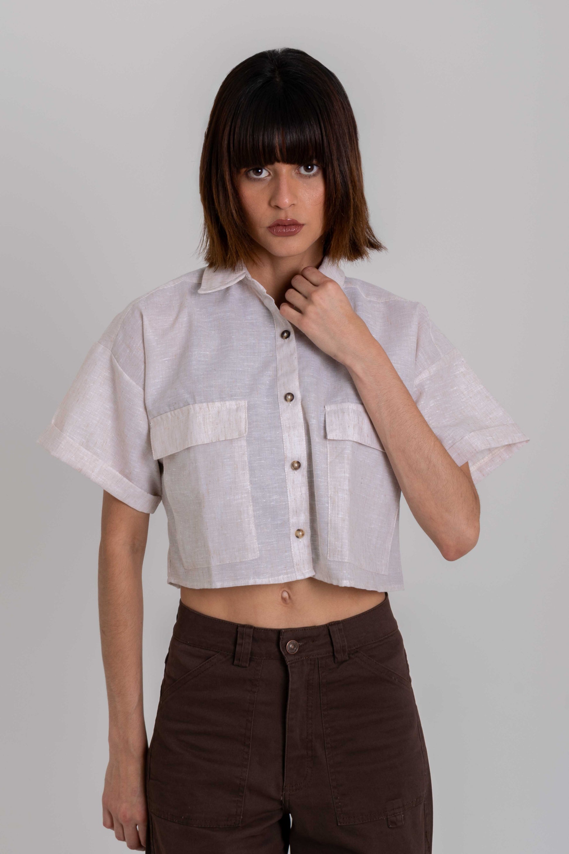 Camisa maxi cruda con bolsillos, de estilo femenino y relajado. Confeccionada en tela (65% poliéster, 35% algodón), combina estructura y frescura. Cuenta con entretela interna 100% poliéster que aporta definición sutil al diseño. Ideal para looks casuales con un toque sofisticado.