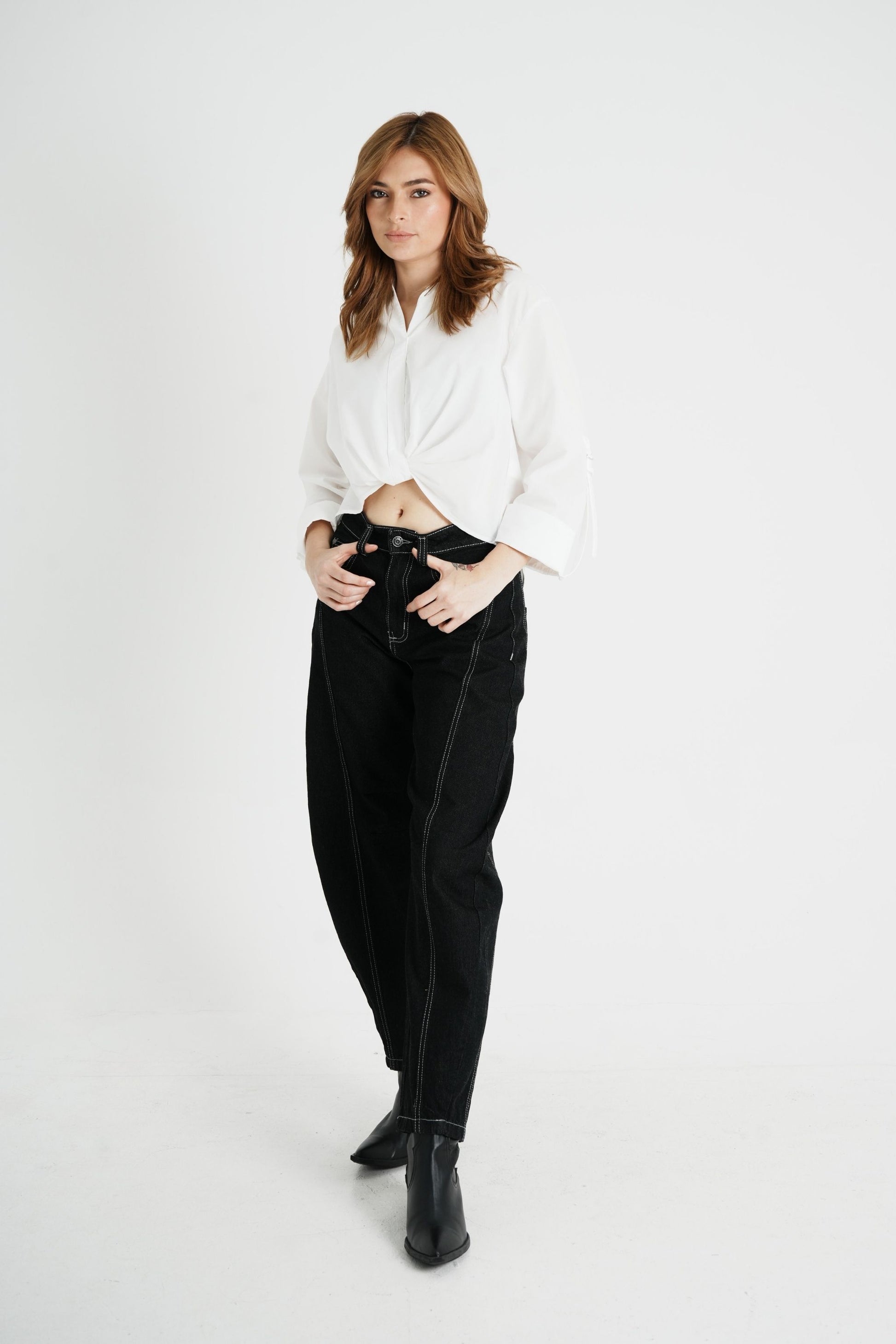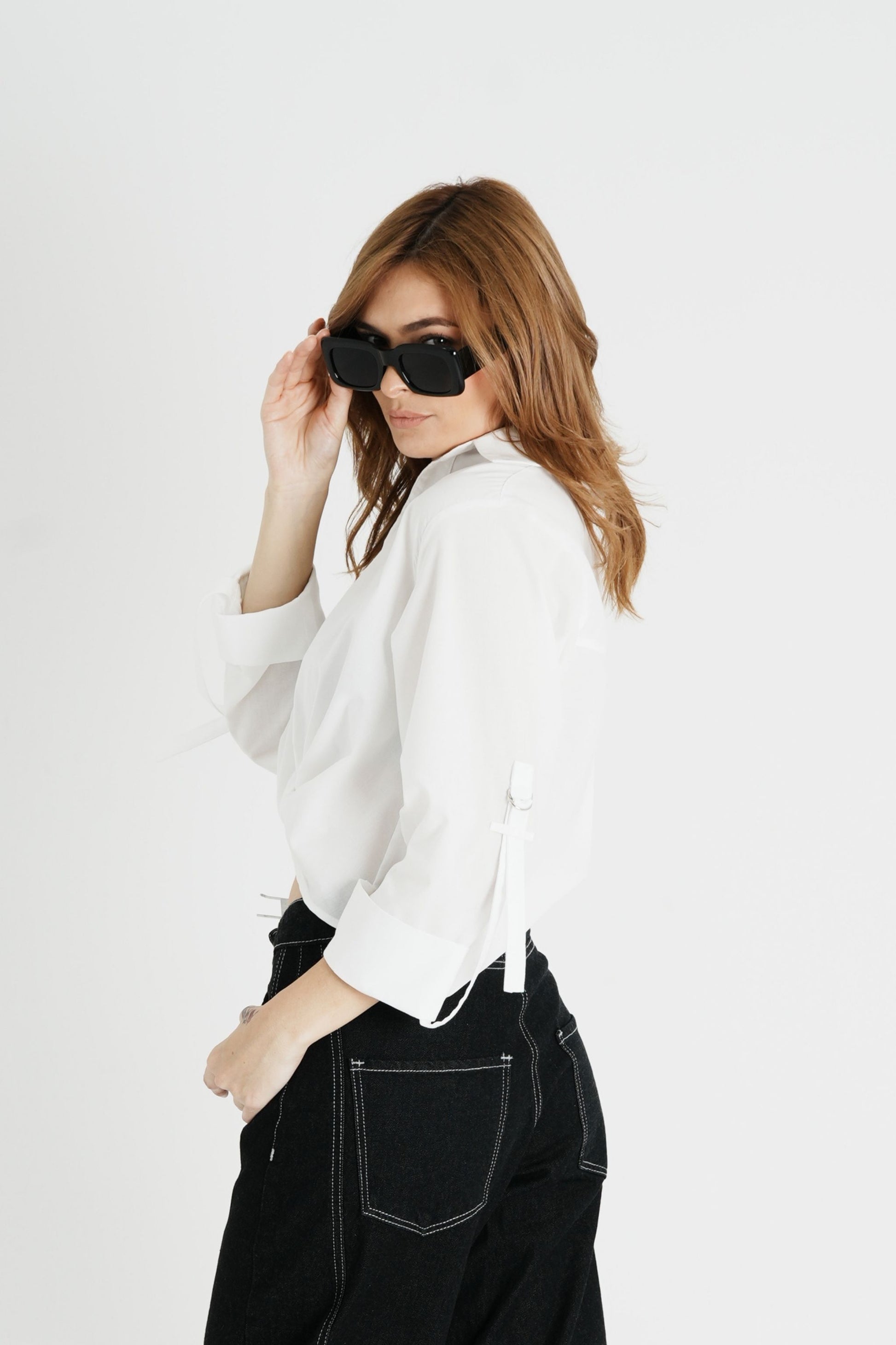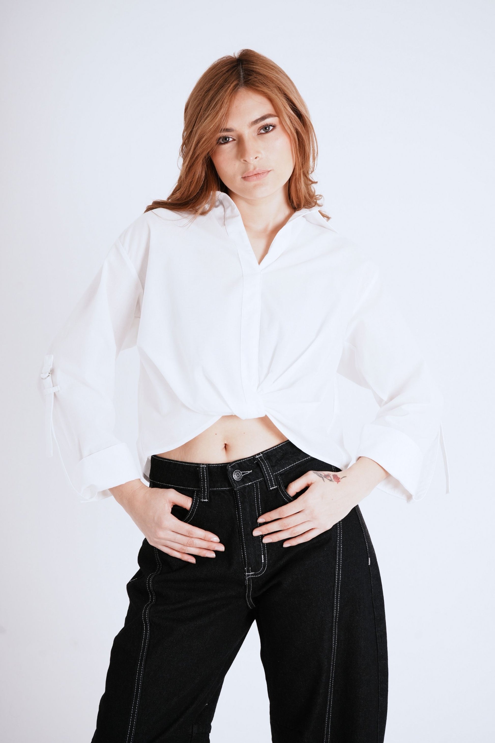 Camisa de popelina con nudo frontal, diseño moderno y versátil para looks casuales y urbanos.