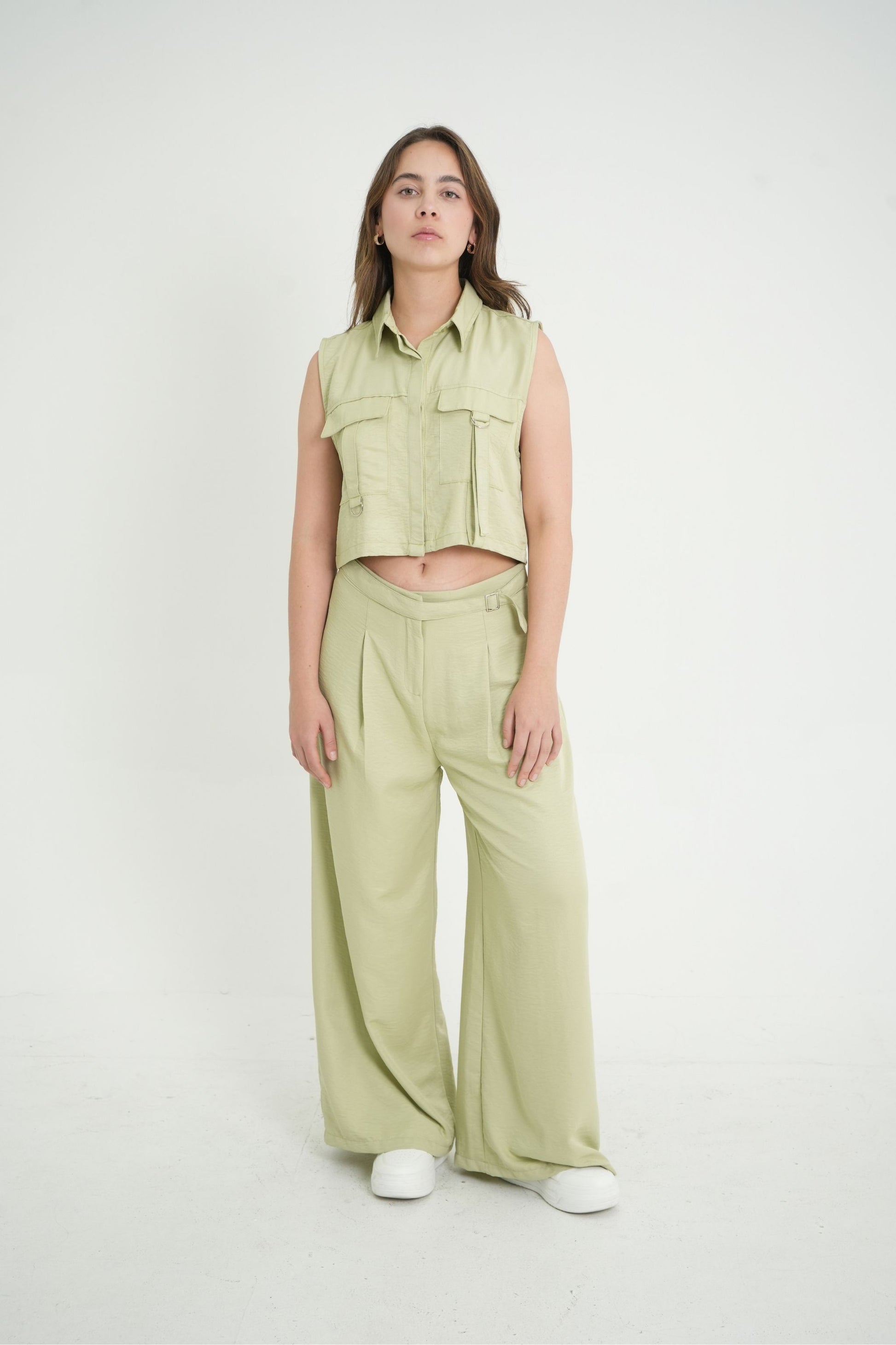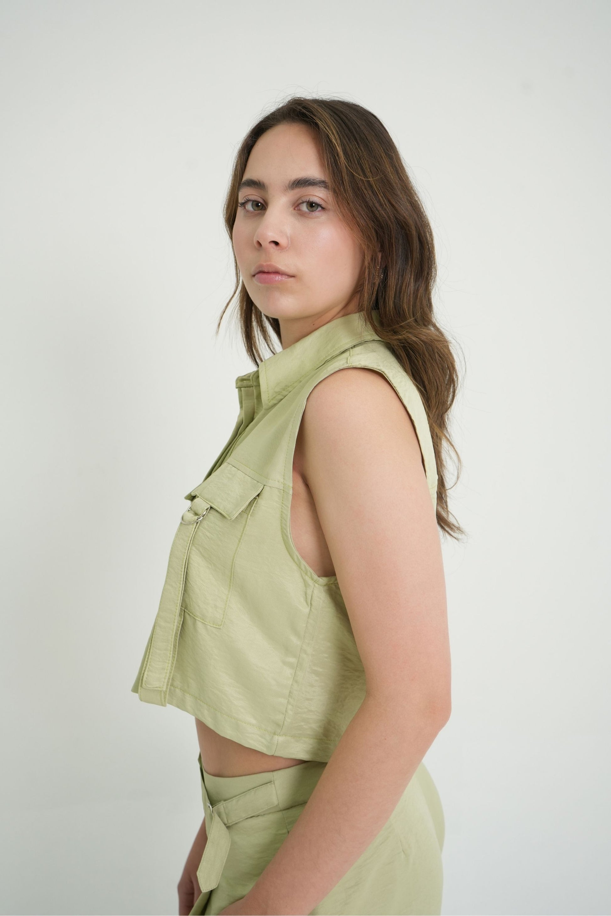 Chaleco femenino tipo cargo en tono verde claro, ideal para un look urbano, moderno y funcional. Confeccionado en textil 100% poliéster, que ofrece resistencia, estructura ligera y un acabado suave al tacto. Incluye entretela (100% poliéster) para mayor soporte y definición en zonas clave.