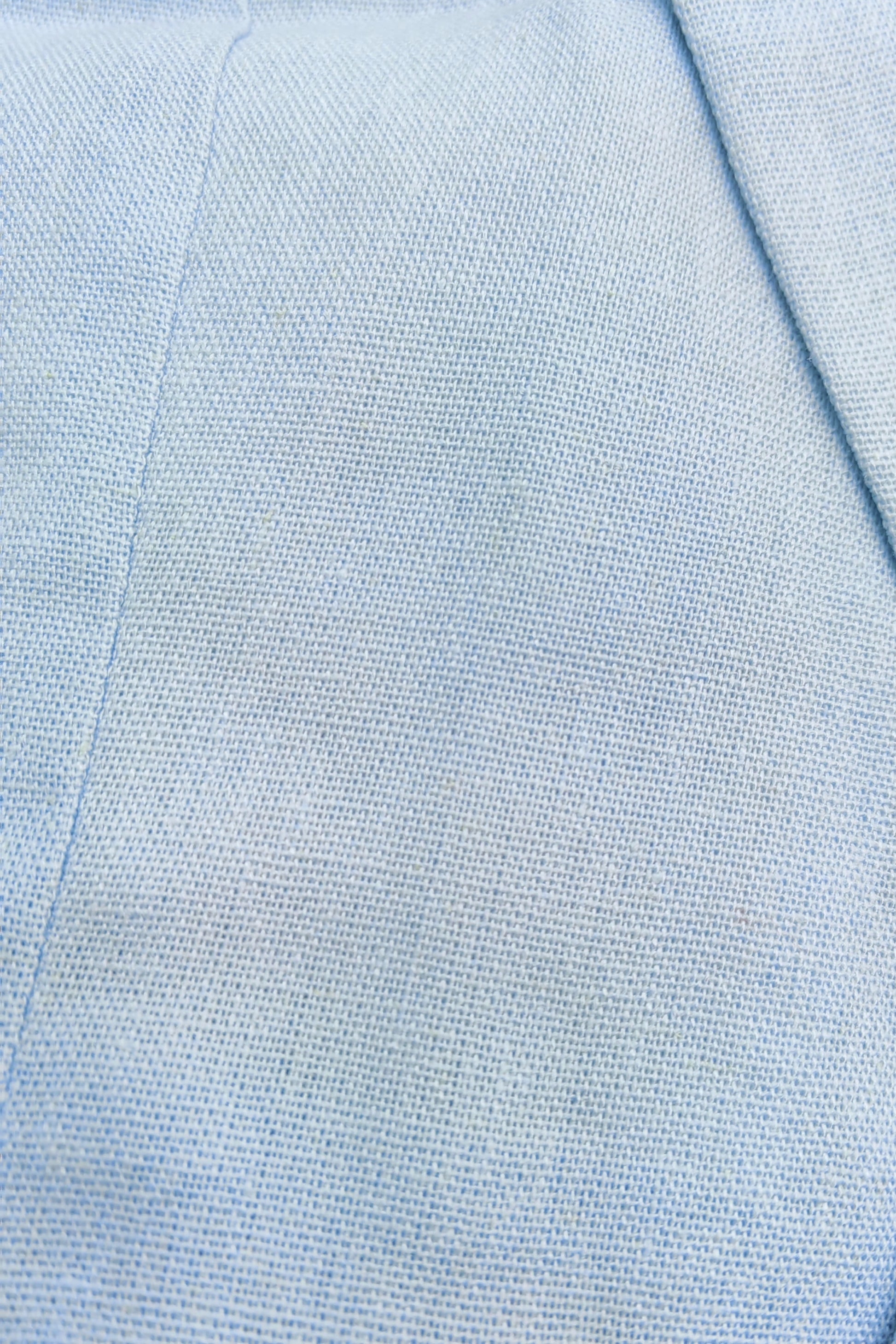 Chaleco femenino tipo tailoring en tono azul claro, perfecto para un look casual con un aire sofisticado. Confeccionado en tejido “Albahaca” (66% rayón, 28% lino, 4% otras fibras), combina frescura, textura natural y fluidez ideal para climas cálidos.