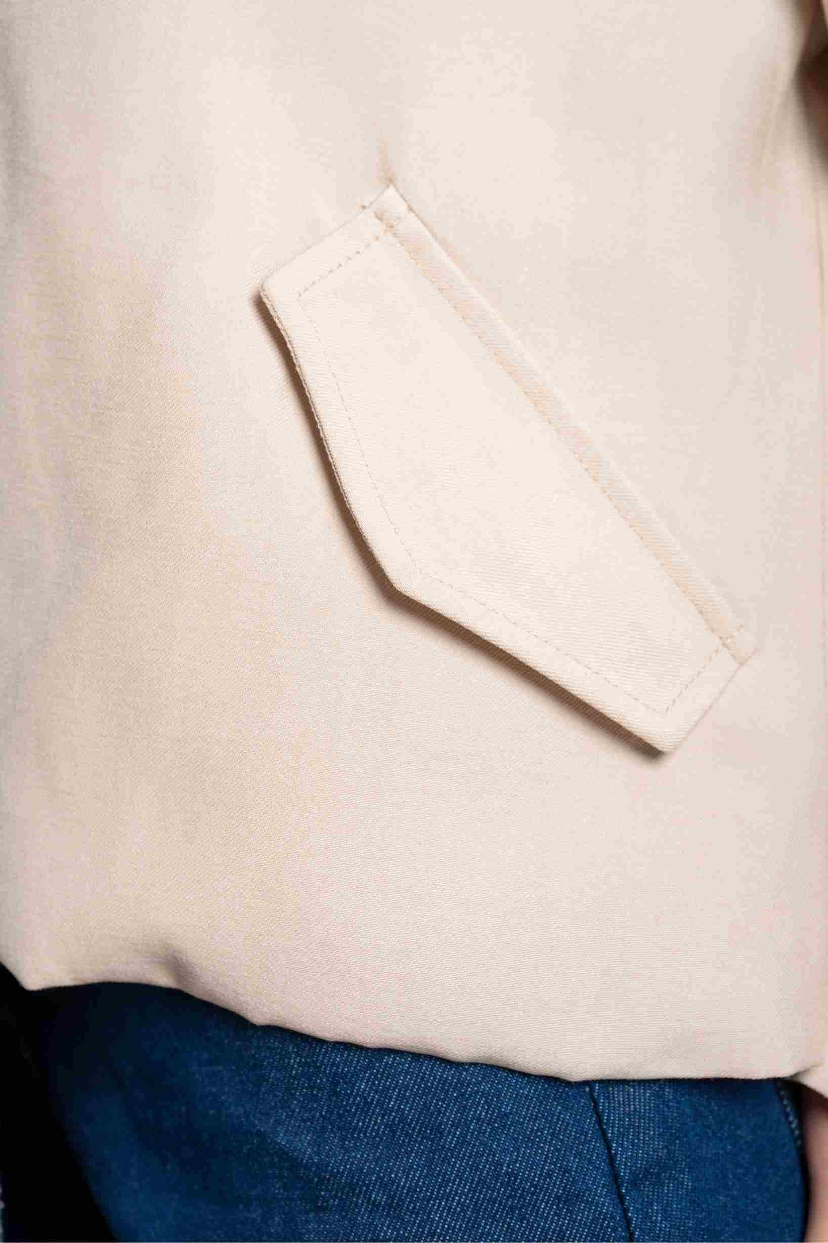 Confeccionada en un tono beige neutro y sofisticado, esta chaqueta se convierte en una pieza fácil de combinar con diferentes outfits. Sus bolsillos laterales funcionales y su silueta amplia la hacen ideal para crear looks cómodos sin perder estilo.