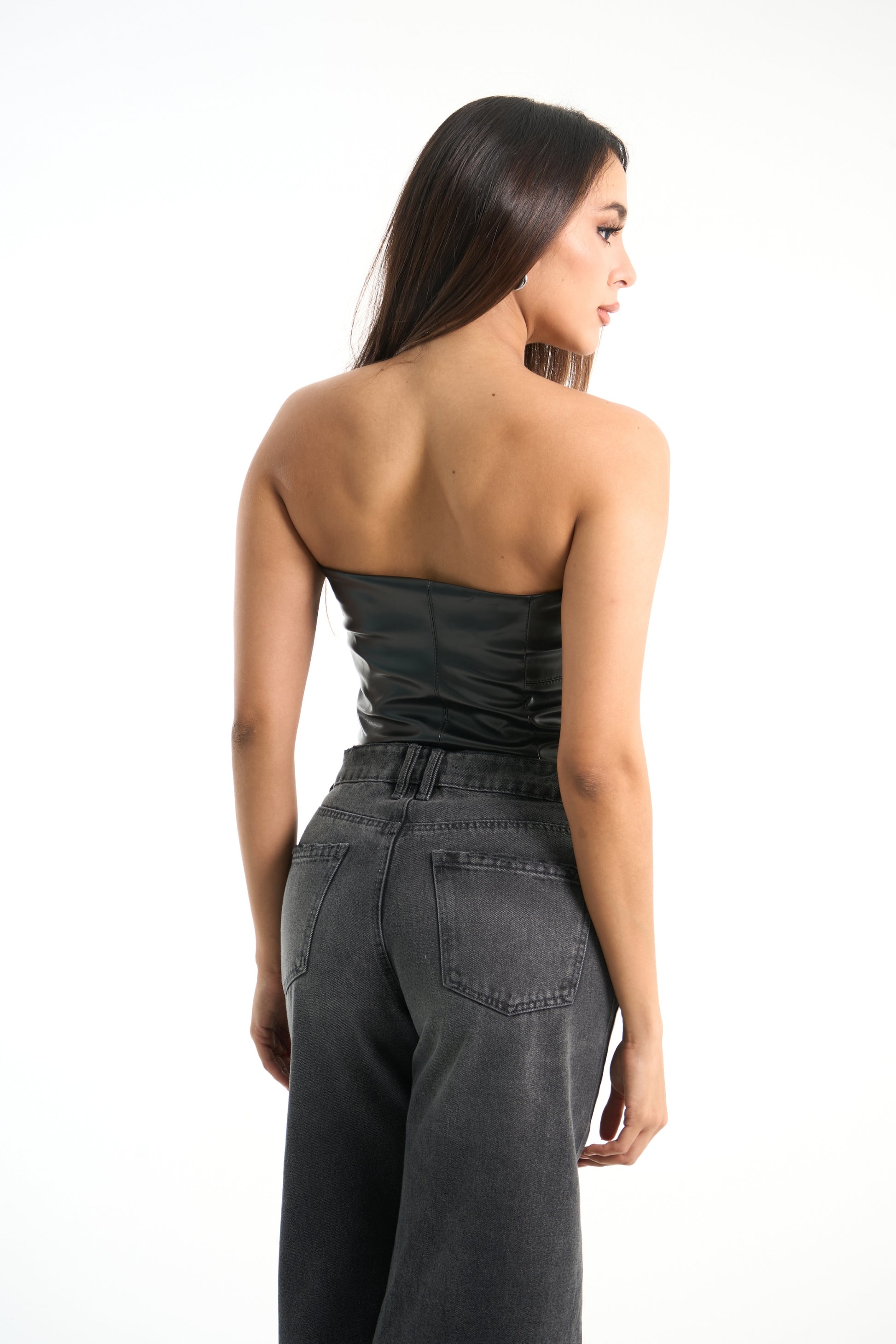 Corset con cremallera en tono negro, diseñado para un estilo urbano con efecto piel. Confeccionado en poliéster 100% con acabado vinílico que simula cuero, ofreciendo estructura, brillo sutil y una silueta firme. Forro interno en poliéster negro para mayor confort al contacto con la piel.