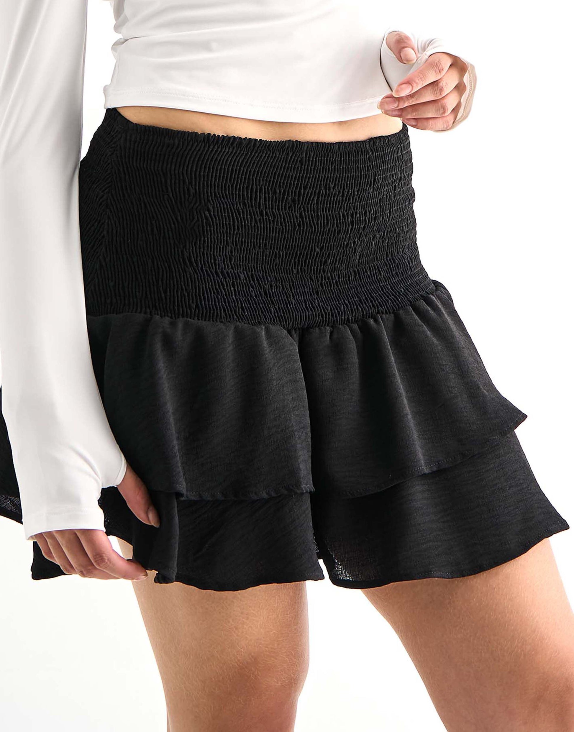 Falda corta con volantes en tonos ivory y negro, perfecta para un estilo femenino y urbano con un toque romántico. Confeccionada en tejido 100% poliéster de textura ligera y caída fluida, ideal para looks frescos y dinámicos.