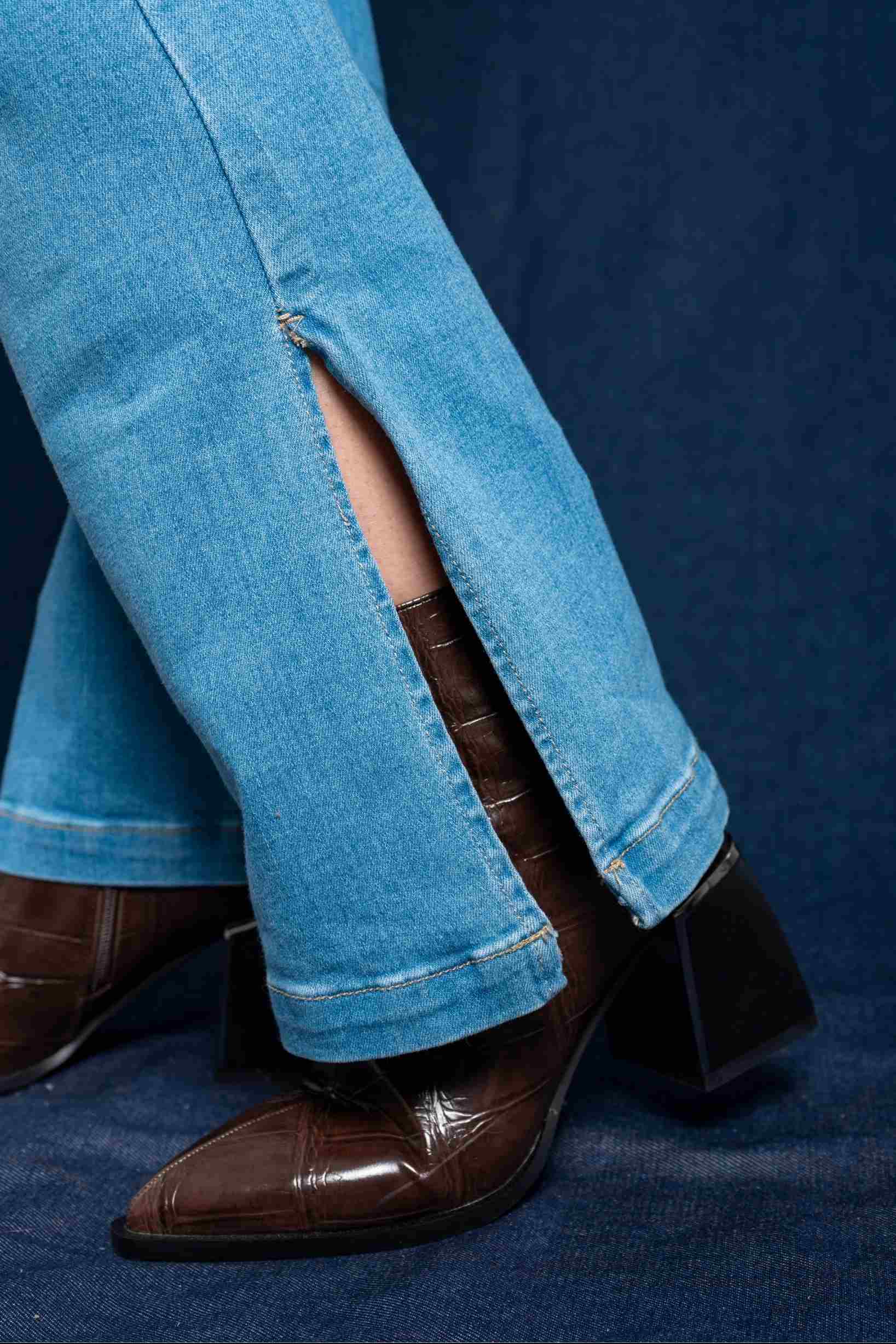 Su corte flare se ajusta suavemente en cadera y muslo para luego abrirse ligeramente en la bota, creando una silueta equilibrada y favorecedora. El detalle de abertura frontal tipo slit en el bajo aporta movimiento y un toque distintivo que eleva el diseño clásico del jean.
