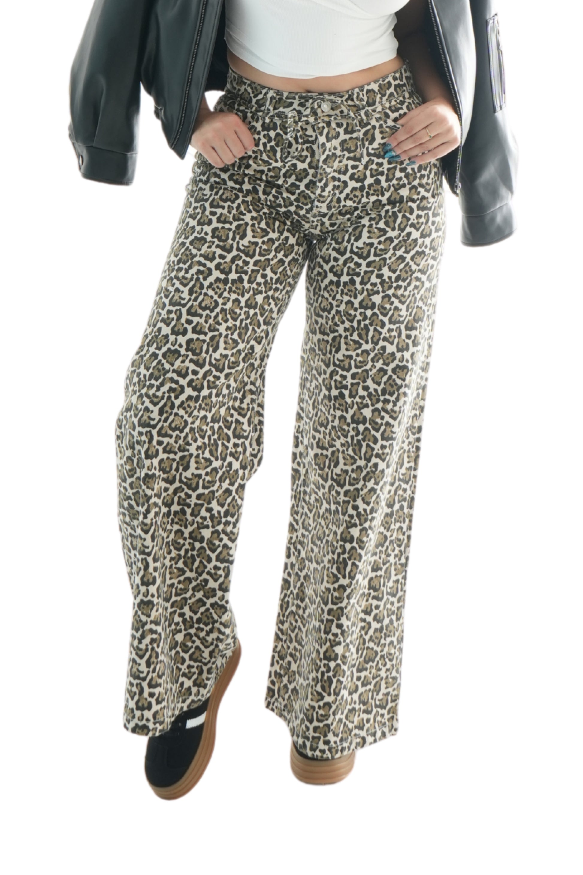 Jean tipo wide leg de tiro alto, confeccionado en tela estampada 100% algodón con diseño tipo leopardo, que aporta una vibra audaz y moderna. Incluye cinturón del mismo tejido para estilizar la silueta y ofrecer un look más completo.