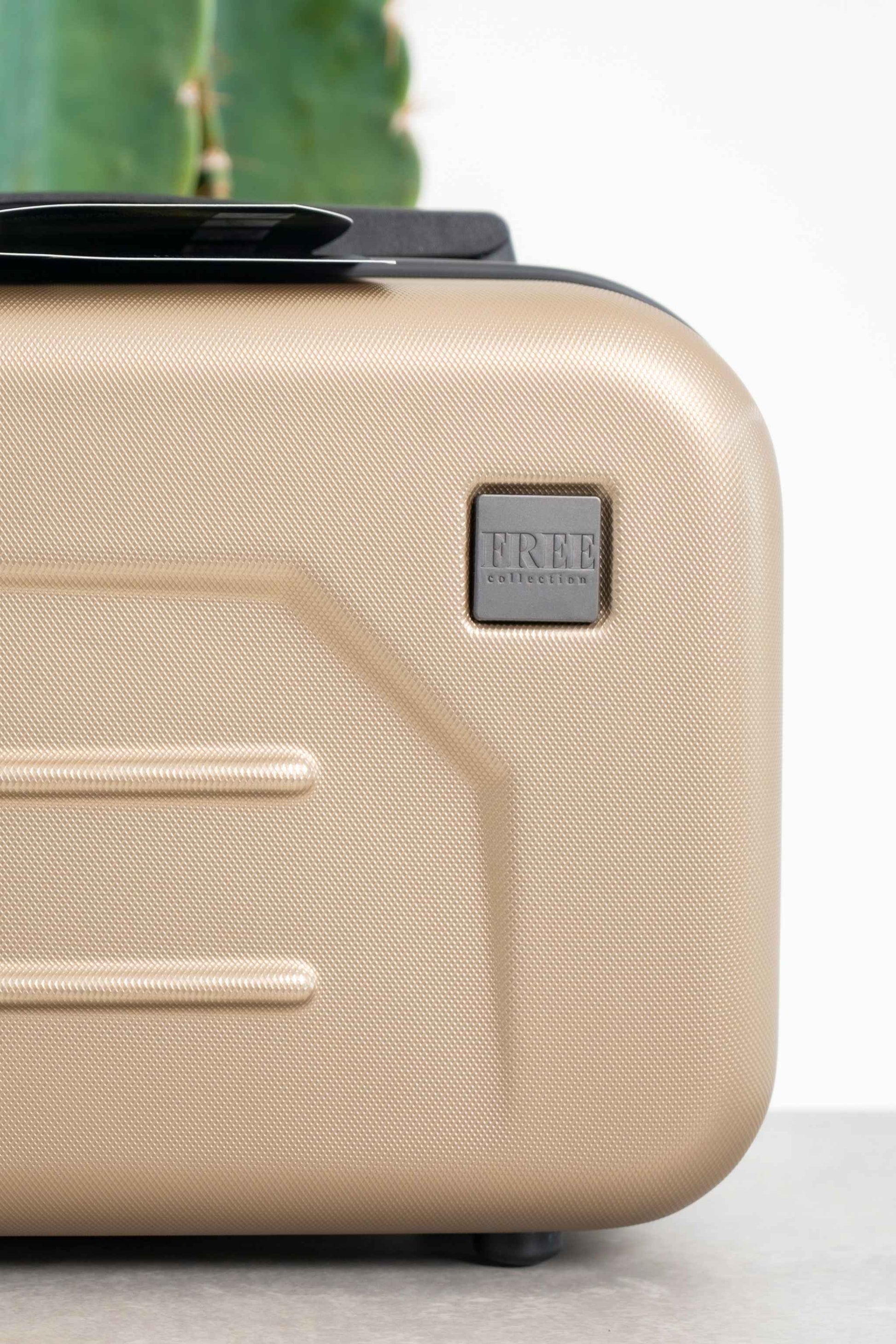Neceser rígido en ABS, resistente a golpes y humedad. Diseño moderno en tono beige con relieves geométricos y cierre de doble vía. Incluye asa superior y emblema frontal decorativo. Perfecto para organizar maquillaje y productos personales en viajes.
