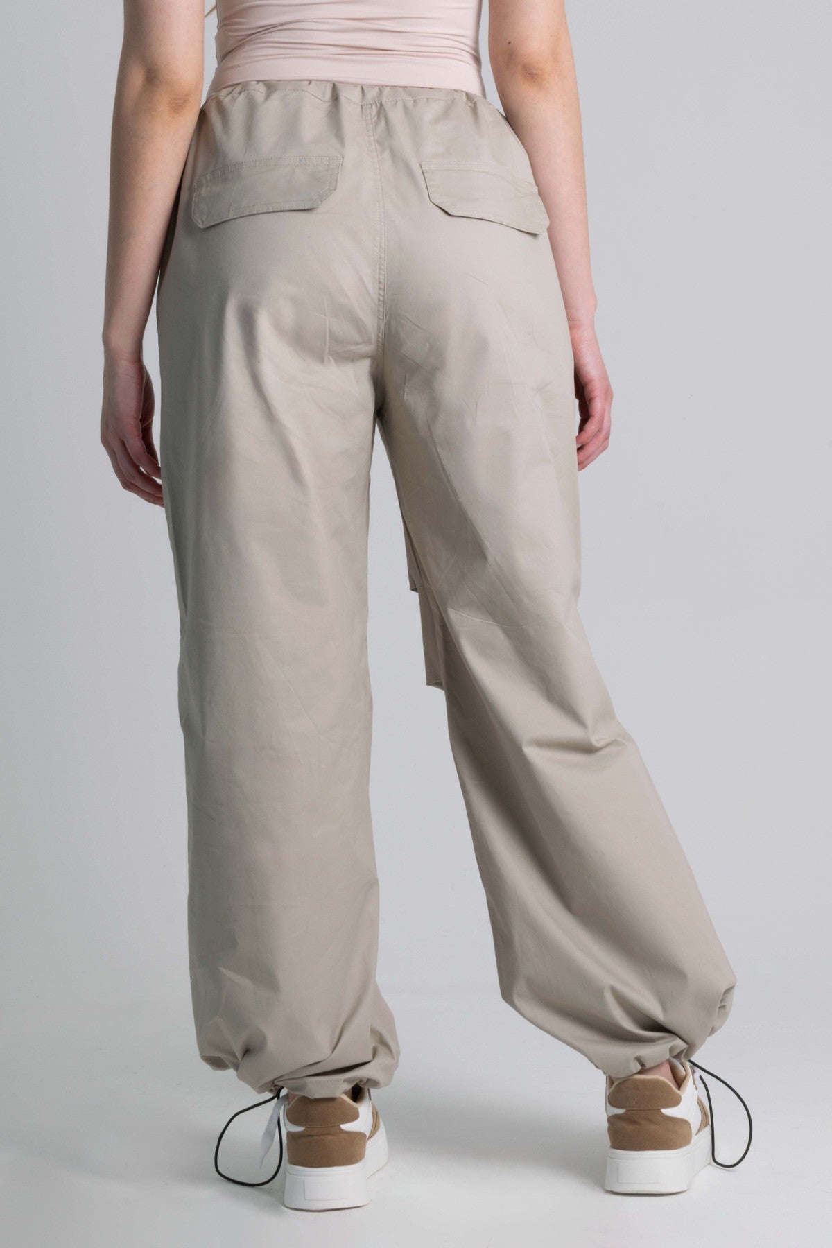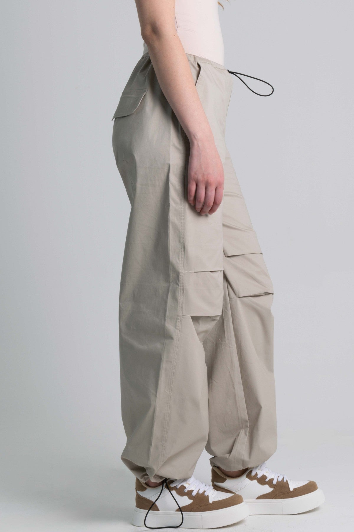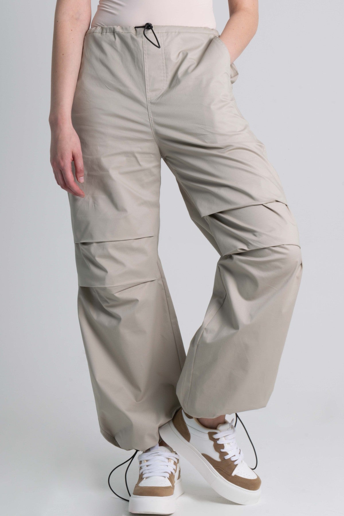 Pantalón tipo parachute femenino, ideal para un look urbano, relajado y con estilo. Confeccionado en tejido (97% algodón, 3% lycra), ofrece comodidad, resistencia y un acabado suave al tacto. Disponible en tonos negro, gris, beige y verde oliva para múltiples combinaciones.