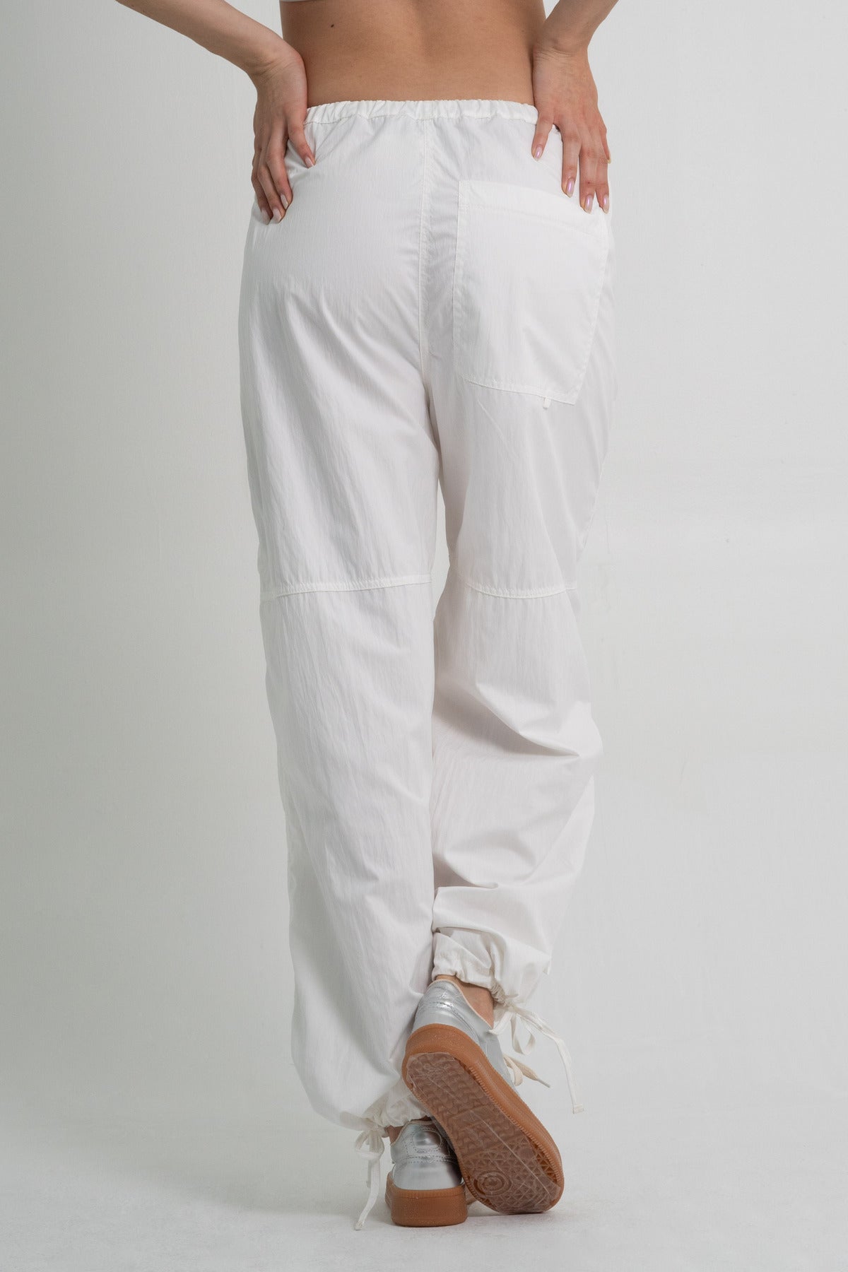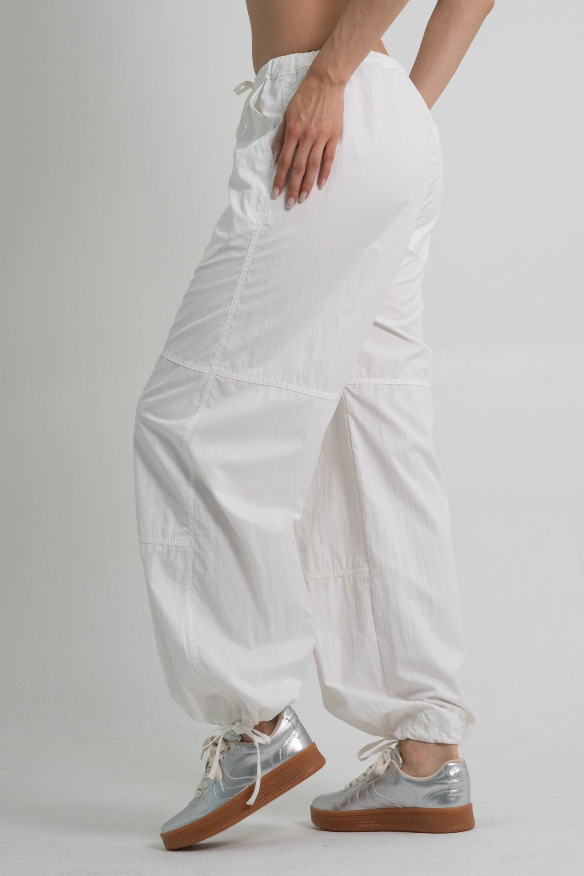 Pantalón parachute femenino en tono ivory, ideal para un look relajado con un toque moderno. Confeccionado en textil (70% poliéster, 30% poliamida), destaca por su ligereza, resistencia y textura suave. Su diseño amplio y cómodo lo convierte en una prenda versátil para uso urbano y casual