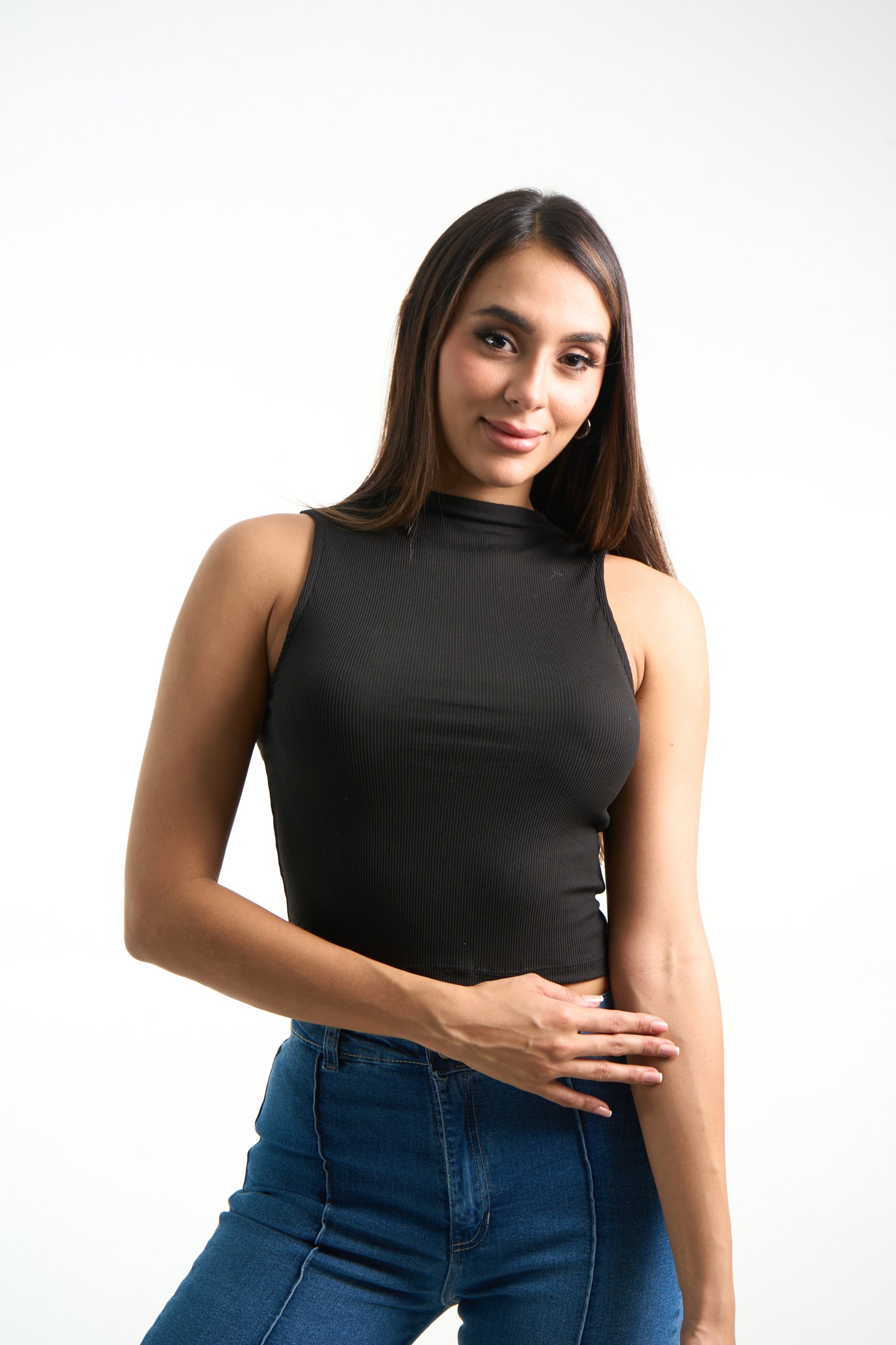 Top rib cuello alto femenino, perfecto para un look urbano y versátil.